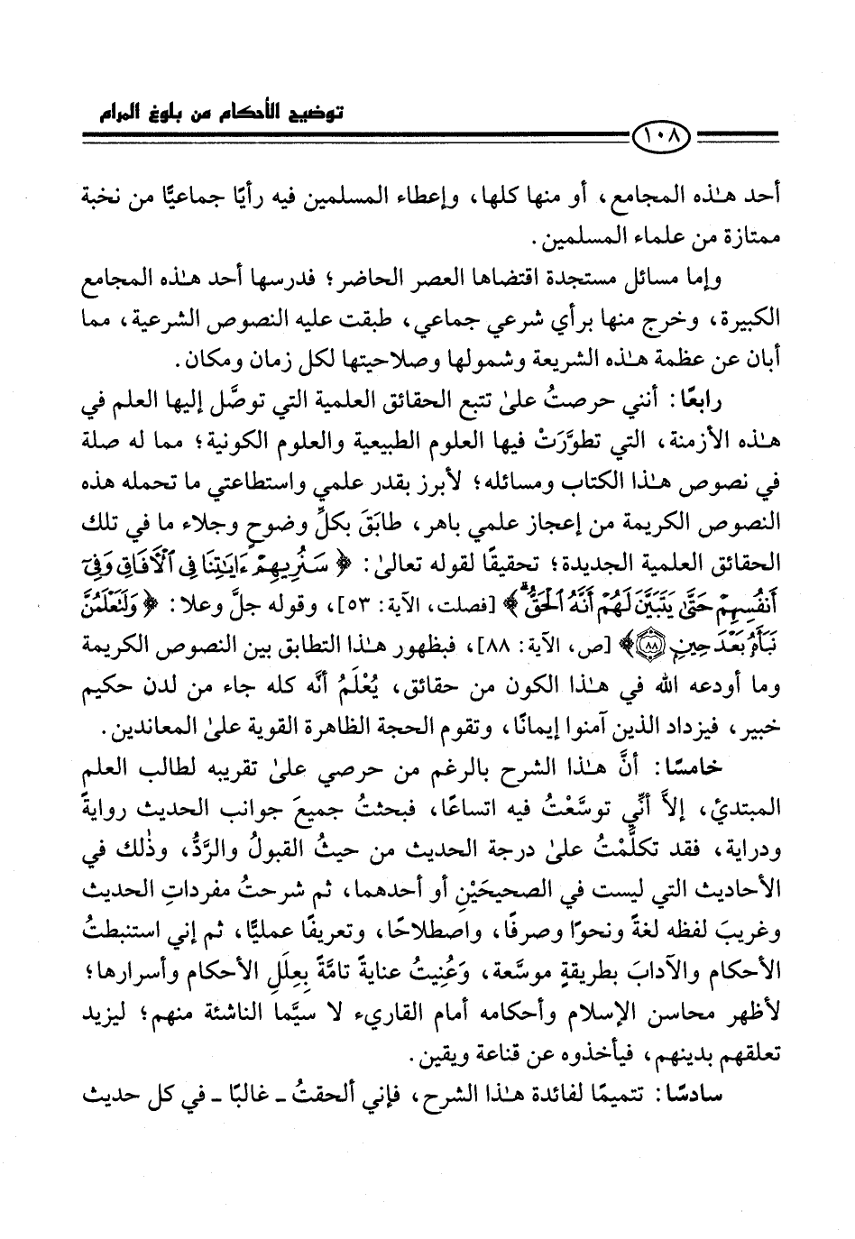 خامسًا: أنَّ هذا الشرح بالرغم من حرصي على تقريبه لطالب العلم المبتدىء، إلاَّ أنِّي توسَّعْتُ فيه اتساعًا، فبحثتُ جميعَ جوانب الحديث روايةً ودراية، فقد تكلَّمْتُ على درجة الحديث من حيثُ القبولُ والرَّدُّ، وذلك في الأحاديث التي ليست في الصحيحَيْنِ أو أحدهما، ثم شرحتُ مفرداتِ الحديث وغريبَ لفظه لغةً ونحوًا وصرفًا، واصطلاحًا، وتعريفًا عمليًّا، ثم إني استنبطتُ الأحكام والآدابَ بطريقةٍ موسَّعة، وَعُنِيتُ عنايةً تامَّةً بعِلَلِ الأحكام وأسرارها؛ لأظهر محاسن الإِسلام وأحكامه أمام القارىء لا سَيَّما الناشئة منهم؛ ليزيد تعلقهم بدينهم، فيأخذوه عن قناعة ويقين.