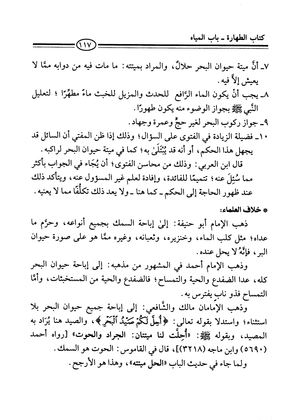 7 - أنَّ ميتة حيوان البحر حلالٌ، والمراد بميتته: ما مات فيه من دوابه ممَّا لا يعيش إلاَّ فيه.
