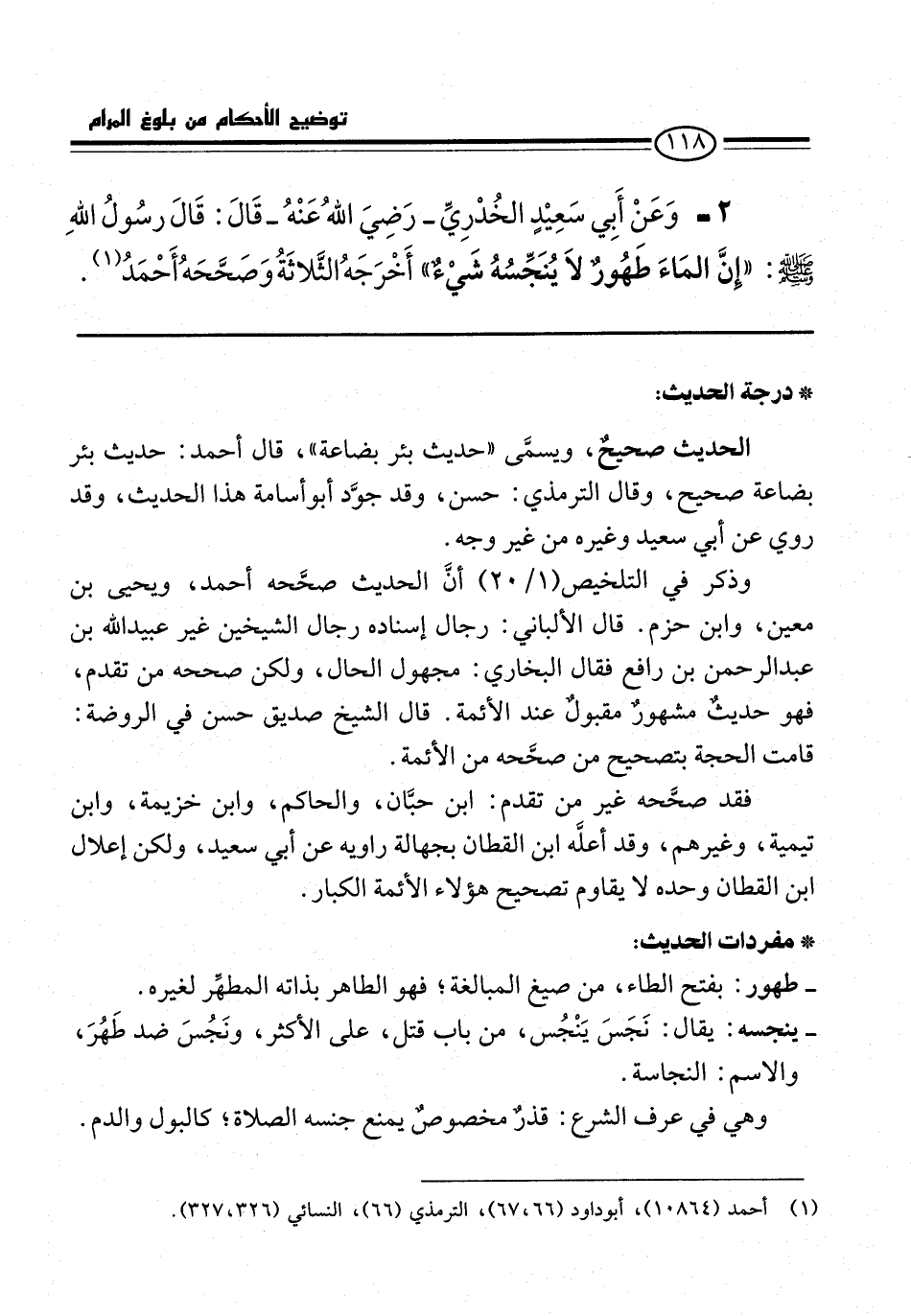 2 - وَعَنْ أَبِي سَعِيدٍ الْخُدْرِيِّ -رضي الله عنه- قَالَ: قَالَ رَسُولُ اللَّهِ -صلى الله عليه وسلم-: "إِنَّ الْمَاءَ طَهُورٌ لاَ يُنَجِّسُهُ شَيْءٌ". أَخْرَجَهُ الثَّلَاثَةُ وَصَحَّحَهُ أَحْمَدُ. (¬1)