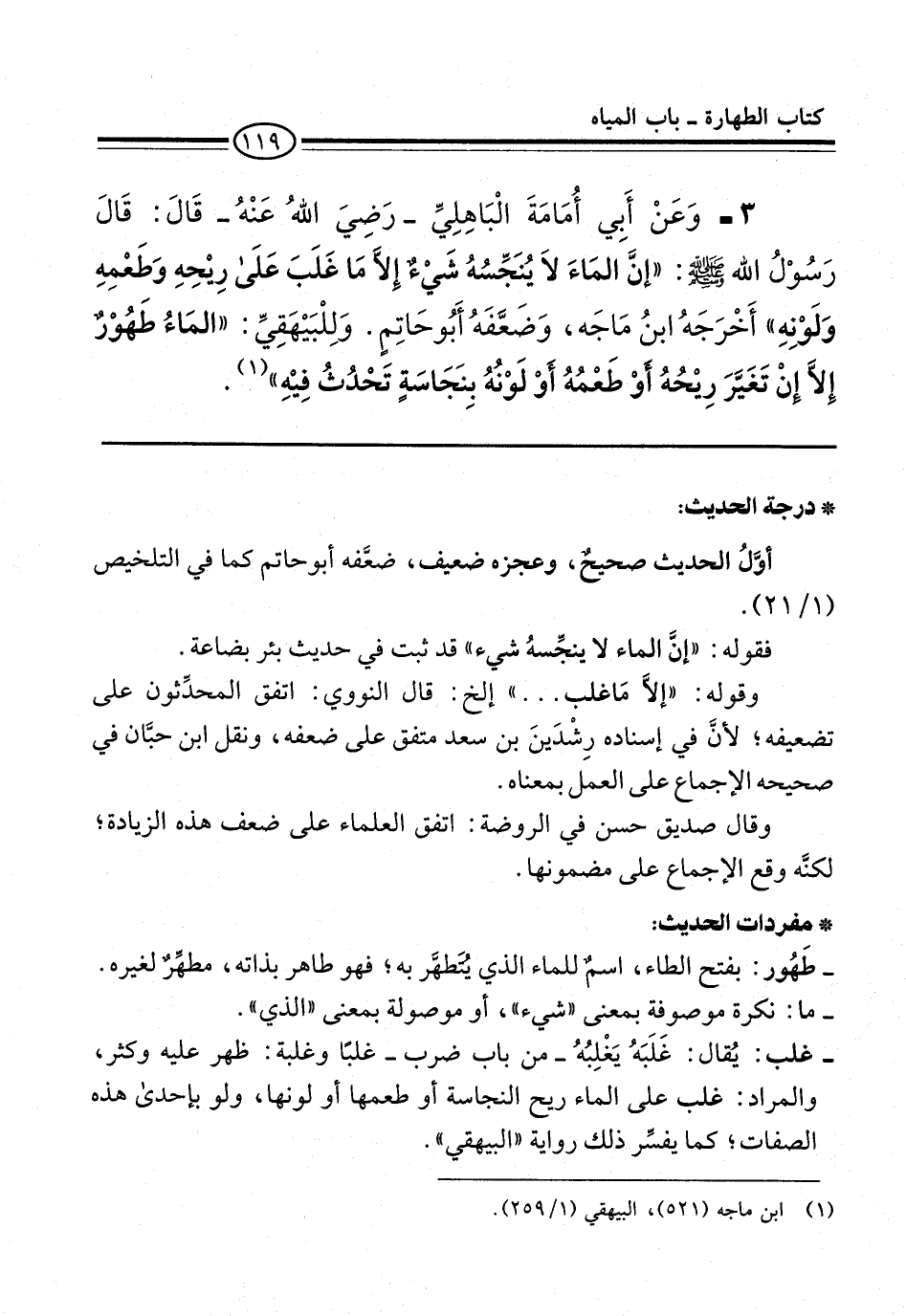3 - وَعَنْ أَبِي أُمَامَةَ الْبَاهِلِيِّ -رضي الله عنه- قَالَ: قَالَ رَسُولُ الله -صلى الله عليه وسلم-: "إِنَّ الْمَاءَ لَا يُنَجِّسُهُ شَيْءٌ إِلاَّ مَا غَلَبَ عَلَى رِيْحِهِ وَطَعْمِهِ وَلَوْنِهِ». أَخْرَجَهُ ابْنُ مَاجَهْ، وَضَعَّفَهُ أَبُو حَاتِمٍ. وَلِلْبَيْهَقِيِّ: "الْمَاءُ طَهُورٌ إِلاَّ إِنْ تَغَيَّرَ رِيحُهُ أَوْ طَعْمُهُ أَوْ لَوْنُهُ بِنَجَاسَةٍ تَحْدُثُ فِيهِ". (¬1)
