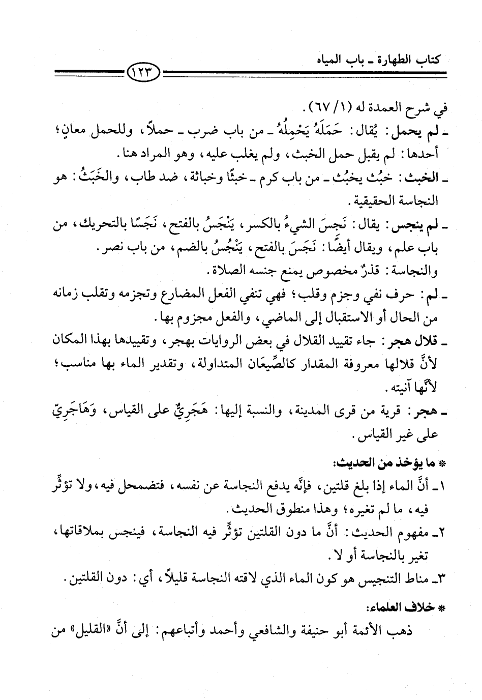 - قلال هجر: جاء تقييد القلال في بعض الروايات بهجر، وتقييدها بهذا المكان لأنَّ قلالها معروفة المقدار كالصِّيعَان المتداولة، وتقدير الماء بها مناسب؛ لأنَّها آنيته.