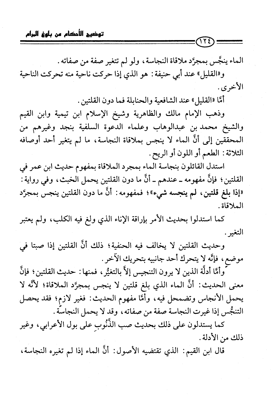 وذهب الإمام مالك والظاهرية وشيخ الإِسلام ابن تيمية وابن القيم والشيغ محمد بن عبد الوهاب وعلماء الدعوة السلفية بنجد وغيرهم من المحققين إلى أنَّ الماء لا ينجس بملاقاة النجاسة، ما لم يتغير أحد أوصافه الثلاثة: الطعم أو اللون أو الريح.