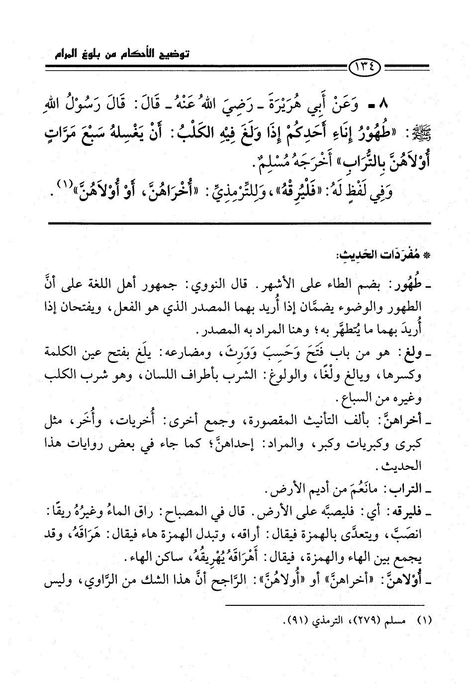 8 - وَعَنْ أَبِي هُرَيْرَةَ -رضي الله عنه- قَالَ: قَالَ رَسُولُ اللَّهِ -صلى الله عليه وسلم-: "طُهُوْرُ إِنَاءِ أَحَدِكُمْ إِذَا وَلَغَ فِيهِ الكَلْبُ: أَنْ يَغْسِلَهُ سَبْعَ مَرَّاتٍ أُوْلَاهُنَّ بِالتُّرَابِ" أَخْرَجَهُ مُسْلِمٌ.