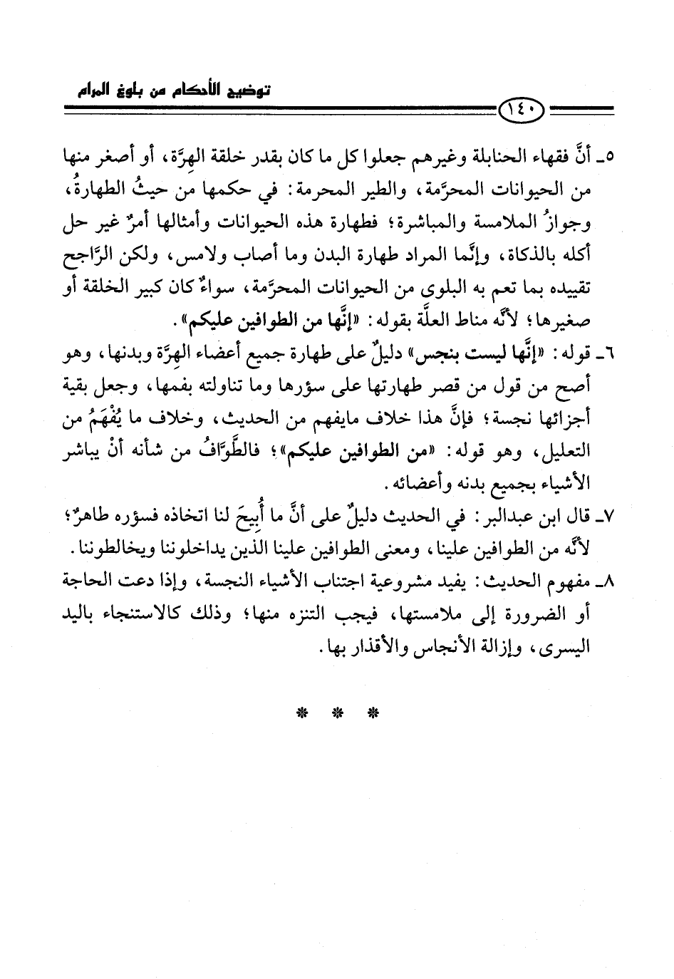 5 - أنَّ فقهاء الحنابلة وغيرهم جعلوا كل ما كان بقدر خلقة الهِرَّة، أو أصغر منها من الحيوانات المحرَّمة، والطير المحرمة: في حكمها من حيثُ الطهارةُ، وجوازُ الملامسة والمباشرة؛ فطهارة هذه الحيوانات وأمثالها أمرٌ غير حل أكله بالذكاة، وإنَّما المراد طهارة البدن وما أصاب ولامس، ولكن الرَّاجح تقييده بما تعم به البلوى من الحيوانات المحرَّمة، سواءٌ كان كبير الخلقة أو صغيرها؛ لأنَّه مناط العلَّة بقوله: "إنَّها من الطوافين عليكم".