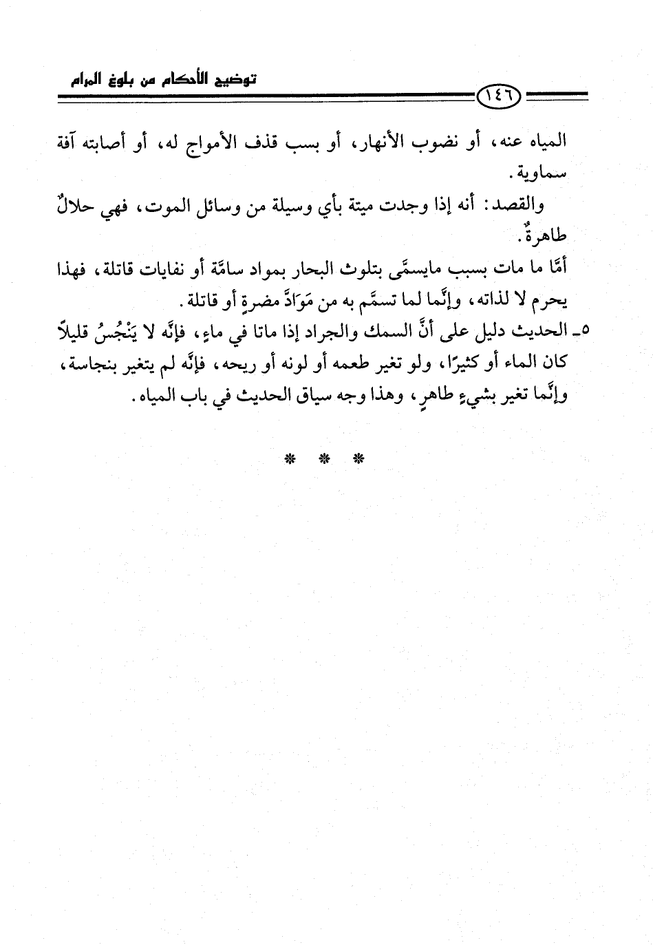 5 - الحديث دليل على أنَّ السمك والجراد إذا ماتا في ماءٍ، فإنَّه لا يَنْجُسُ قليلاً كان الماء أو كثيرًا، ولو تغير طعمه أو لونه أو ريحه، فإنَّه لم يتغير بنجاسة، وإنَّما تغير بشيءٍ طاهرٍ، وهذا وجه سياق الحديث في باب المياه.