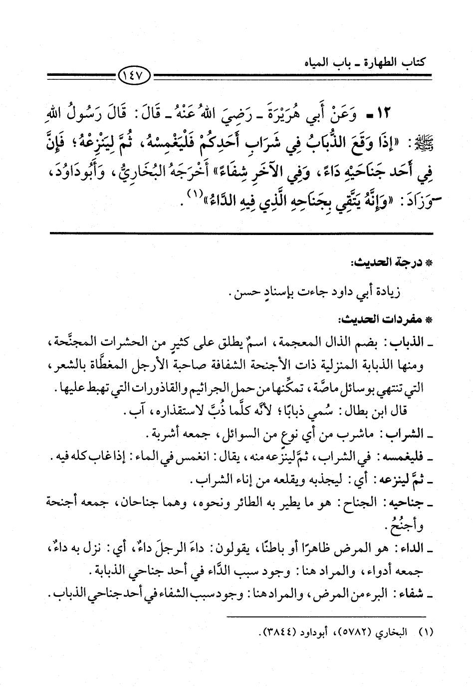 12 - وَعَنْ أَبِي هُرَيْرَةَ -رضي الله عنه- قَالَ: قَالَ رَسُولُ اللَّهِ -صلى الله عليه وسلم-: "إِذَا وَقَعَ الذُّبَابُ فِي شَرَابِ أَحَدِكُمْ فَلْيَغْمِسْهُ, ثُمَّ لِيَنْزِعْهُ, فَإِنَّ فِي أَحَدِ جَنَاحَيْهِ دَاءً, وَفِي الْآخَرِ شِفَاءً". أَخْرَجَهُ الْبُخَارِيُّ، وَأَبُو دَاوُدَ, وَزَادَ: "وَإِنَّهُ يَتَّقِي بِجَنَاحِهِ الَّذِي فِيهِ الدَّاءُ" (¬1)