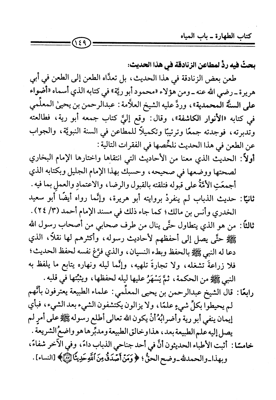 رابعًا: قال الشيخ عبد الرحمن بن يحيى المعلِّمي: علماء الطبيعة يعترفون بأنَّهم لم يحيطوا بكلِّ شيءٍ علمًا، ولا يزالون يكتشفون الشيء بعد الشيء، فبأي إيمان ينفي أبو رية وأضرابُهُ أنْ يكون الله تعالى أطلع رسوله -صلى الله عليه وسلم- على أمرٍ لم يصل إليه علم الطبيعة بعد، هذا وخالق الطبيعة ومدبِّرها هو واضعُ الشريعة.