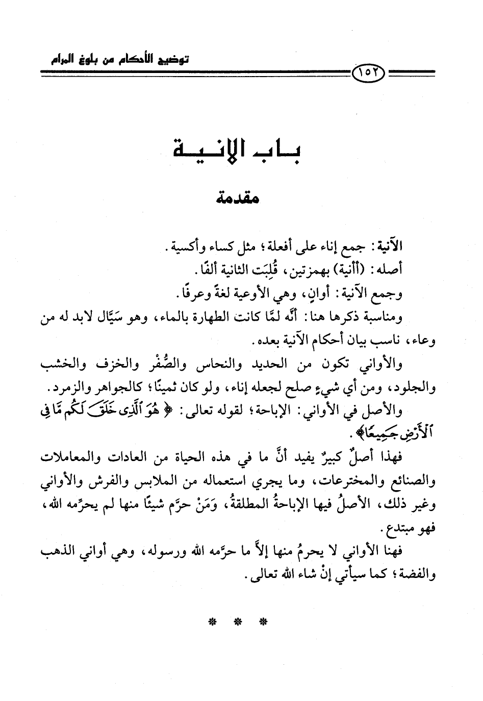 ومناسبة ذكرها هنا: أنَّه لمَّا كانت الطهارة بالماء، وهو سَيَّال لابد له من وعاء، ناسب بيان أحكام الآنية بعده.