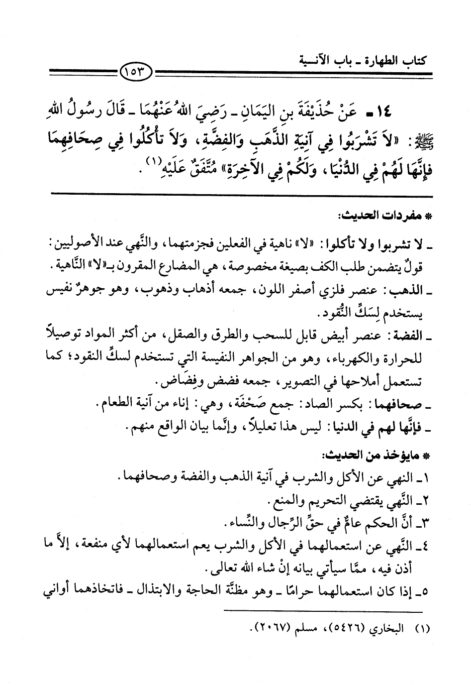 14 - عَنْ حُذَيْفَةَ بْنِ الْيَمَانِ -رَضِيَ اللَّهُ عَنْهُمَا- قَالَ رسُولُ اللهِ -صلى الله عليه وسلم-: "لاَ تَشْرَبُوا فِي آنِيَةِ الذَّهَبِ والْفِضَّةِ، وَلَا تَأْكُلُوا فِي صِحَافِهَا فَإِنَّهَا لَهُمْ فِي الدُّنْيَا، وَلَكُمْ فِي الْآخِرَةِ" مُتَّفَقٌ عَلَيْهِ. (¬1)