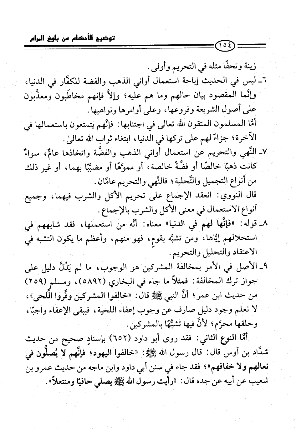 7 - النَّهي والتحريم عن استعمال أواني الذهب والفضة واتخاذها عامٌّ، سواءٌ كانت ذهبًا خالصًا أو فضَّةً خالصة، أو مموَّهًا أو مضبَّبًا بهما، أو غير ذلك من أنواع التجميل والتَّحلية؛ فالنَّهي والتحريم عامَّان.