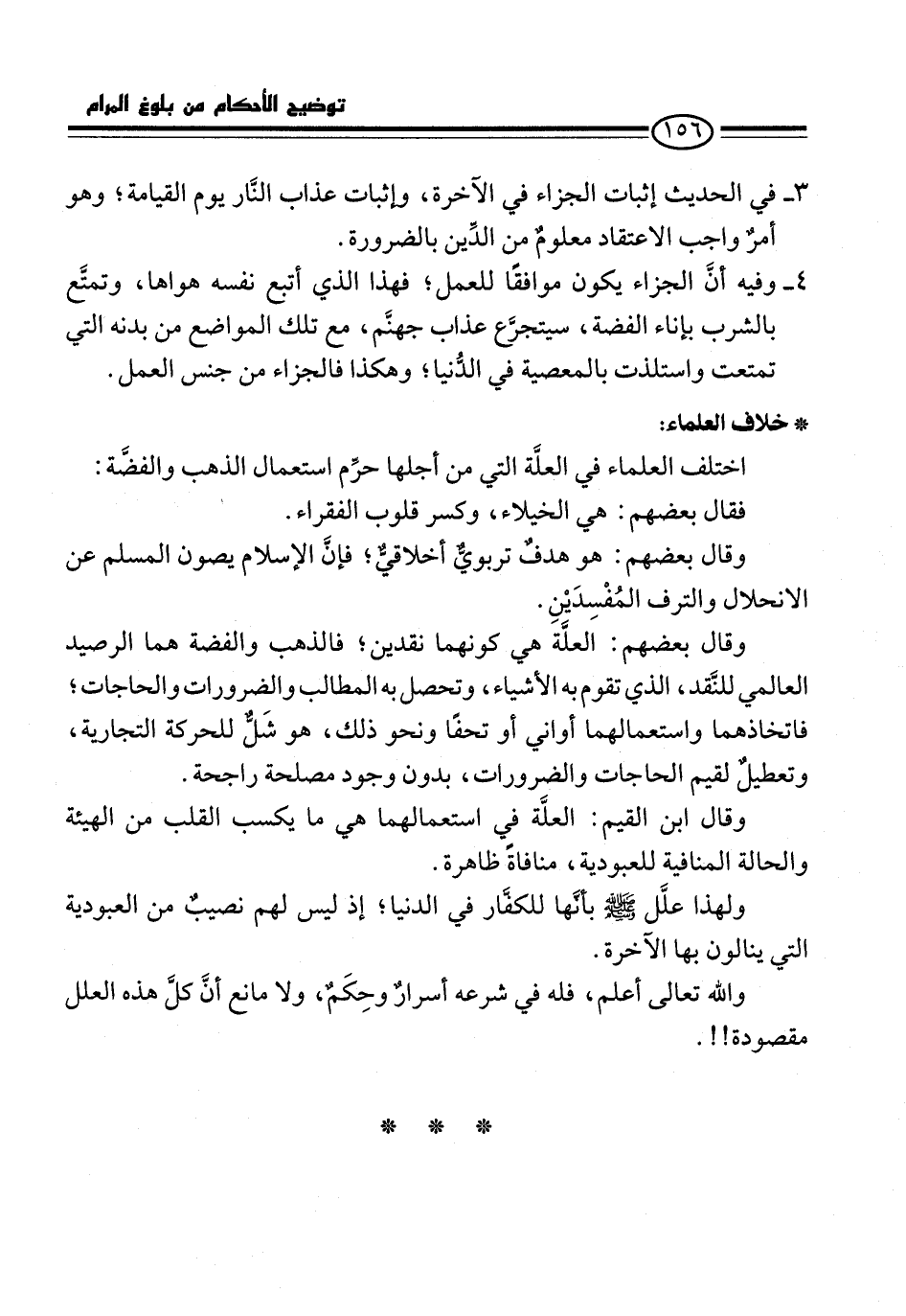 وقال بعضهم: العلَّة هي كونهما نقدين؛ فالذهب والفضة هما الرصيد العالمي للنَّقد، الذي تقوم به الأشياء، وتحصل به المطالب والضرورات والحاجات؛ فاتخاذهما واستعمالهما أواني أو تحفًا ونحو ذلك، هو شَلٌّ للحركة التجارية، وتعطيلٌ لقيم الحاجات والضرورات، بدون وجود مصلحة راجحة.