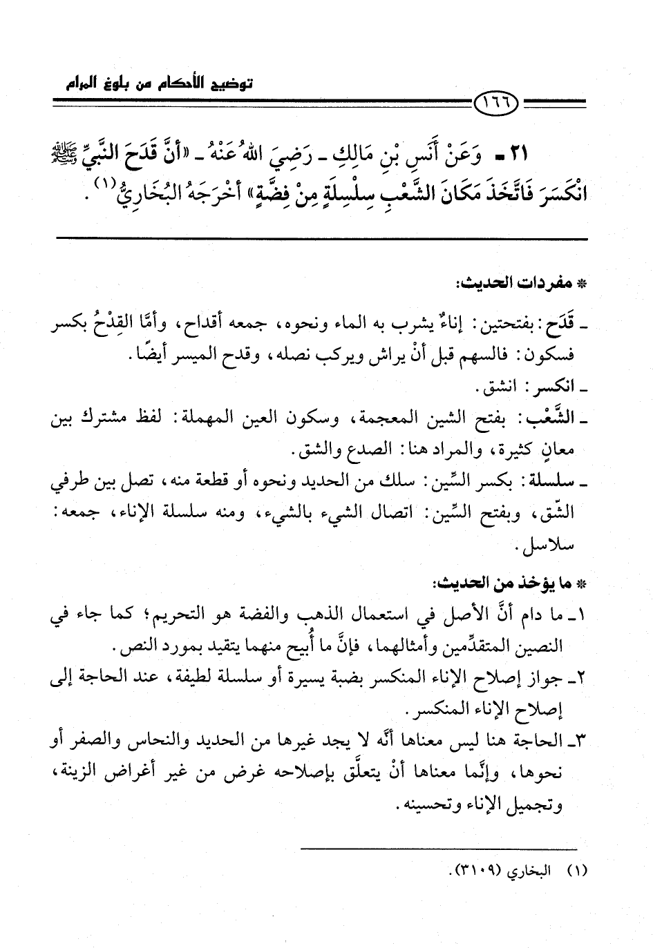 21 - وَعَنْ أَنَسِ بْنِ مَالِكٍ -رضي الله عنه- "أَنَّ قَدَحَ النَّبِيِّ -صلى الله عليه وسلم- انْكَسَرَ، فَاتَّخَذَ مَكَانَ الشَّعْبِ سِلْسِلَةٍ مِنْ فِضَّةٍ" أَخْرَجَهُ البُخَارِيُّ (¬1).