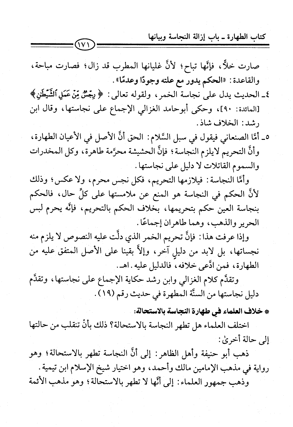 5 - أمَّا الصنعاني فيقول في سبل السَّلام: الحق أنَّ الأصل في الأعيان الطهارة، وأنَّ التحريم لا يلزم النجاسة؛ فإنَّ الحشيشة محرَّمة طاهرة، وكل المخدرات والسموم القاتلات لا دليل على نجاستها.