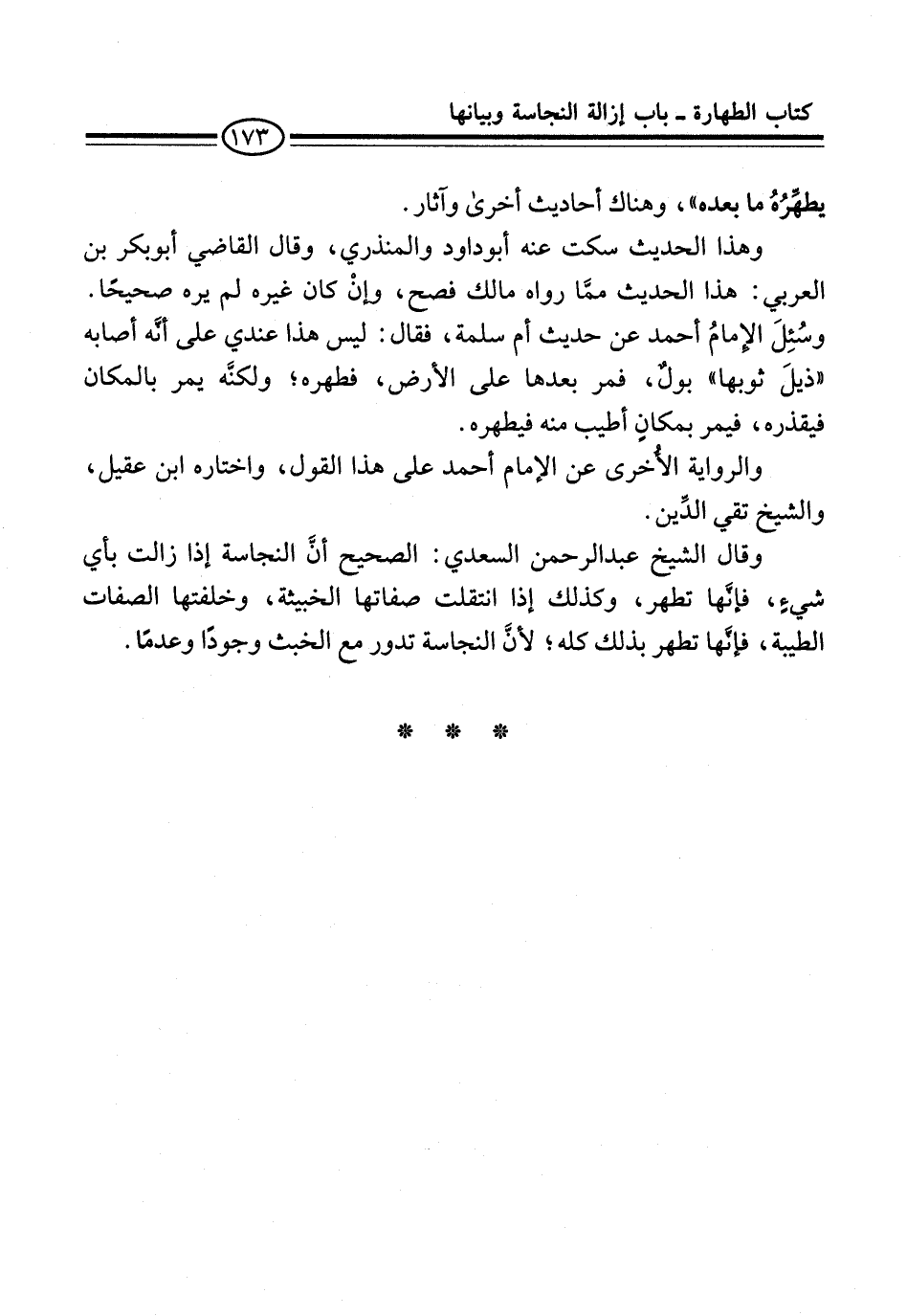 وقال الشيخ عبد الرحمن السعدي: الصحيح أن النجاسة إذا زالت بأي شيءٍ، فإنَّها تطهر، وكذلك إذا انتقلت صفاتها الخبيثة، وخلفتها الصفات الطيبة، فإنَّها تطهر بذلك كله؛ لأنَّ النجاسة تدور مع الخبث وجودًا وعدمًا.
