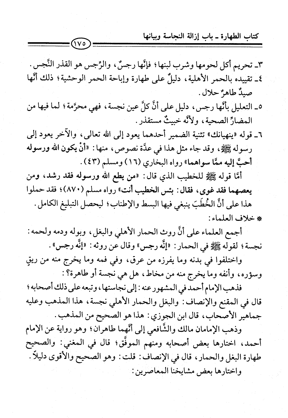 وذهب الإمامان مالك والشَّافعي إلى أنَّهما طاهران؛ وهو رواية عن الإمام أحمد، اختارها بعض أصحابه ومنهم الموفَّق؛ قال في المغني: والصحيح طهارة البغل والحمار، قال في الإنصاف: قلت: وهو الصحيح والأقوى دليلاً.