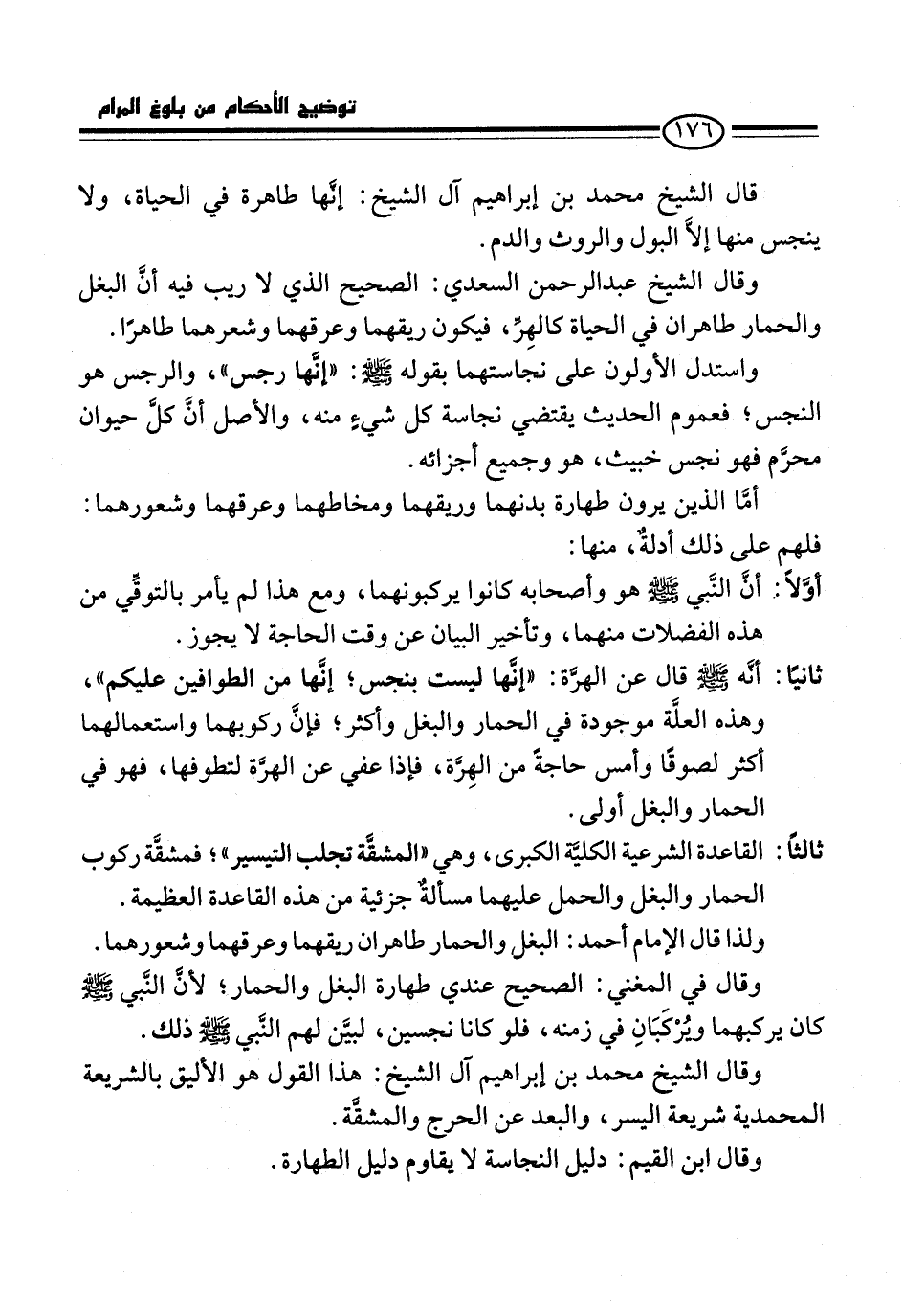 وقال الشيخ عبد الرحمن السعدي: الصحيح الذي لا ريب فيه أنَّ البغل والحمار طاهران في الحياة كالهِرِّ، فيكون ريقهما وعرقهما وشعرهما طاهرًا.