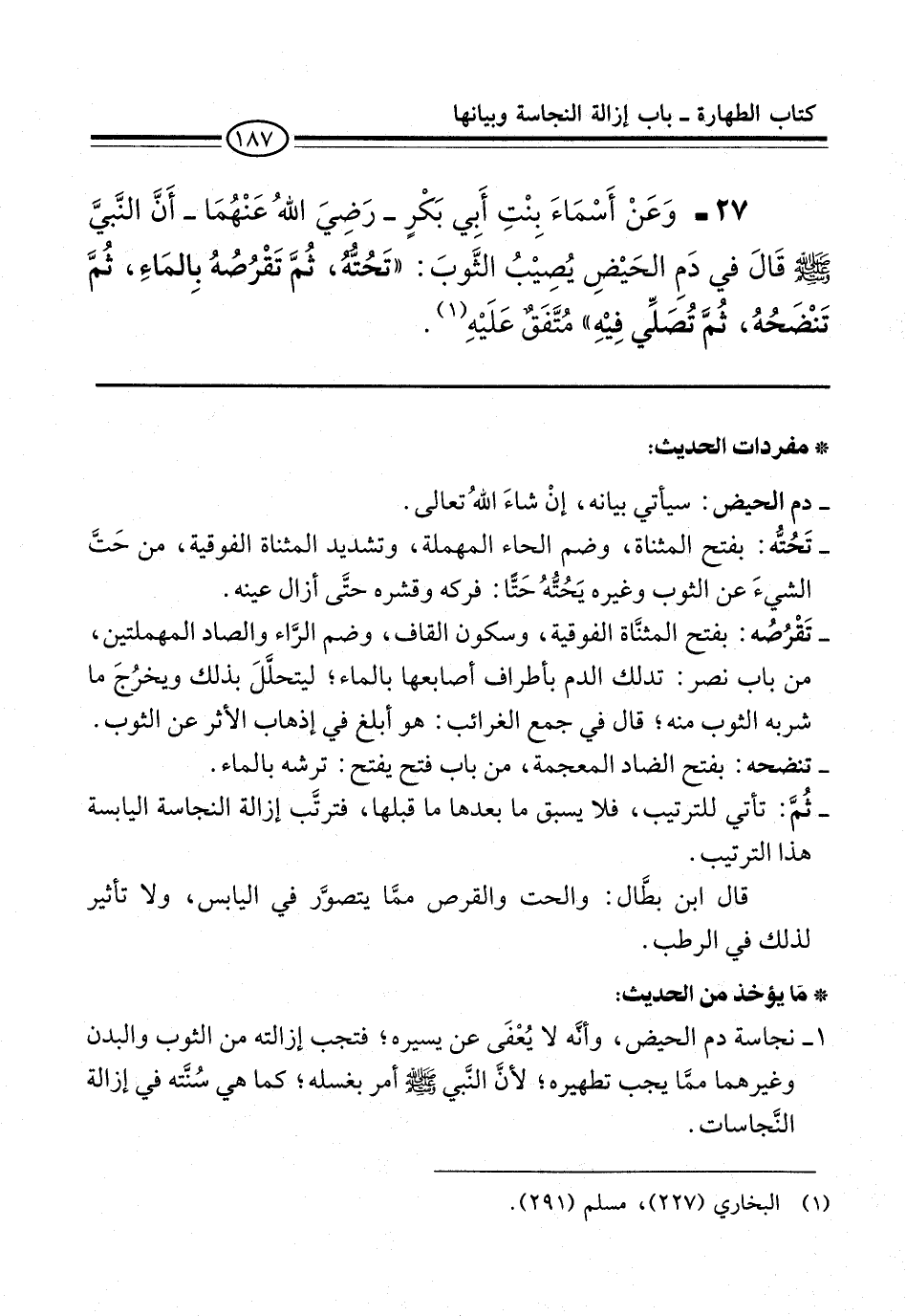27 - وَعَنْ أَسْمَاءَ بِنْتِ أَبِي بَكْرٍ -رَضِيَ اللَّهُ عَنْهُمَا- أَنَّ النَّبِيَّ -صلى الله عليه وسلم- قَالَ فِي دَمِ الْحَيْضِ يُصِيْبُ الثَّوْبَ: "تَحُتُّهُ, ثُمَّ تَقْرُصُهُ بِالْمَاءِ, ثُمَّ تَنْضَحُهُ, ثُمَّ تُصَلِّي فِيهِ" مُتَّفَقٌ عَلَيْهِ (¬1).
