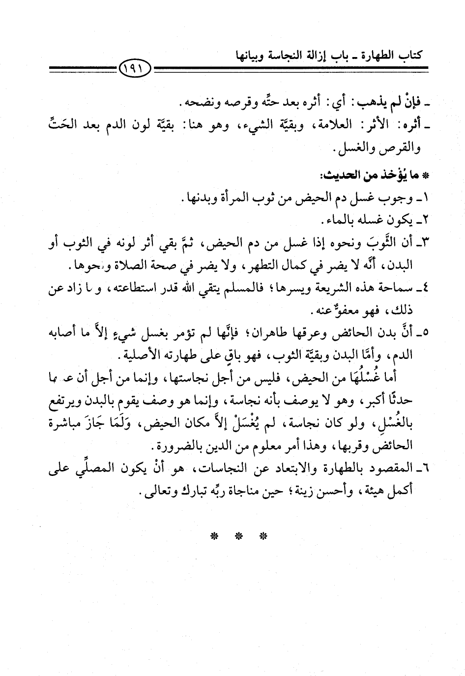 3 - أن الثَّوبَ ونحوه إذا غسل من دم الحيض، ثُمَّ بقي أثر لونه في الثوب أو البدن، أنَّه لا يضر في كمال التطهر، ولا يضر في صحة الصلاة ونحوها.