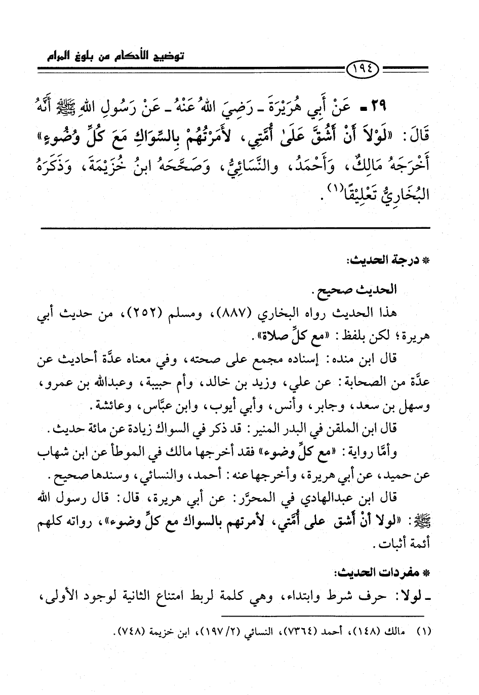29 - عَنْ أَبِي هُرَيْرَةَ -رضي الله عنه- عَنْ رَسُولِ اللَّهِ -صلى الله عليه وسلم- أَنَّهُ قَالَ: "لَوْلَا أَنْ أَشُقَّ عَلَى أُمَّتِي، لَأَمَرْتُهُمْ بِالسِّوَاكِ مَعَ كُلِّ وُضُوءٍ" أَخْرَجَهُ مَالِكٌ, وأَحْمَدُ, وَالنَّسَائِيُّ, وَصَحَّحَهُ ابْنُ خُزَيْمَة، وَذَكَرَهُ البُخَارِيُّ تَعْلِيْقًا (¬1).