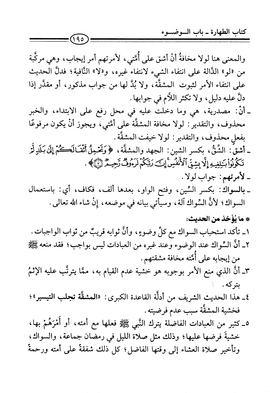 والمعنى هنا لولا مخافةُ أنْ أشق على أُمَّتي، لأمرتهم أمر إيجاب، وهي مركَّبة من "لو" الدَّالة على انتفاء الشيء لانتفاء غيره، و"لا" النَّافية؛ فدلَّ الحديث على انتفاء الأمر لثبوت المشقَّة، ولابُدَّ لها من جواب مذكور، أو مقدَّر إذا دلَّ عليه دليل، ولا تكثر اللَّام في جوابها.