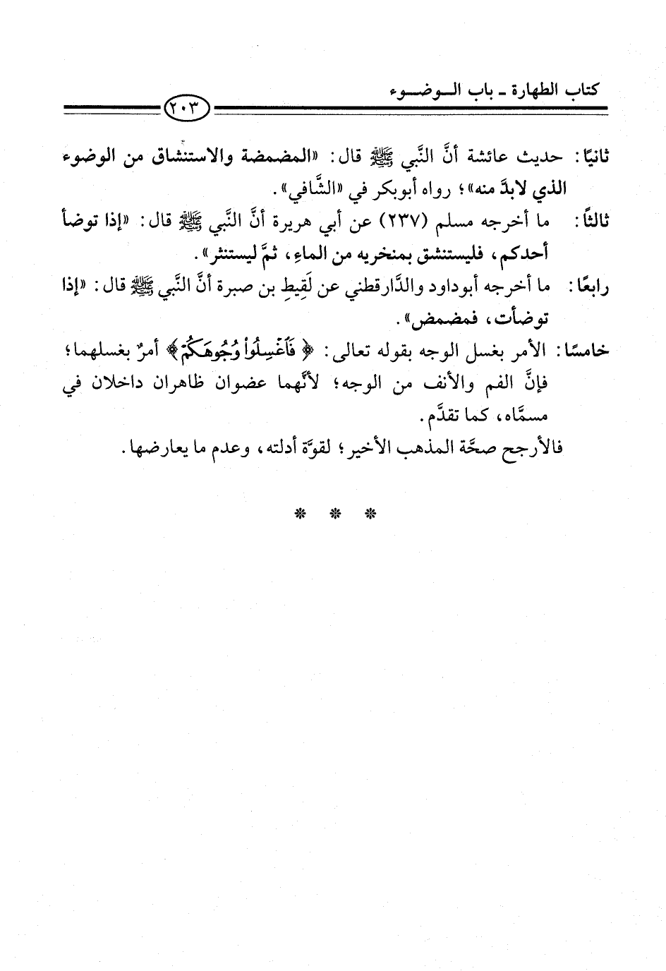ثالثًا: ما أخرجه مسلم (237) عن أبي هريرة أنَّ النَّبي -صلى الله عليه وسلم- قال: "إذا توضأ أحدكم، فليستنشق بمنخريه من الماءِ، ثمَّ ليستنثر".