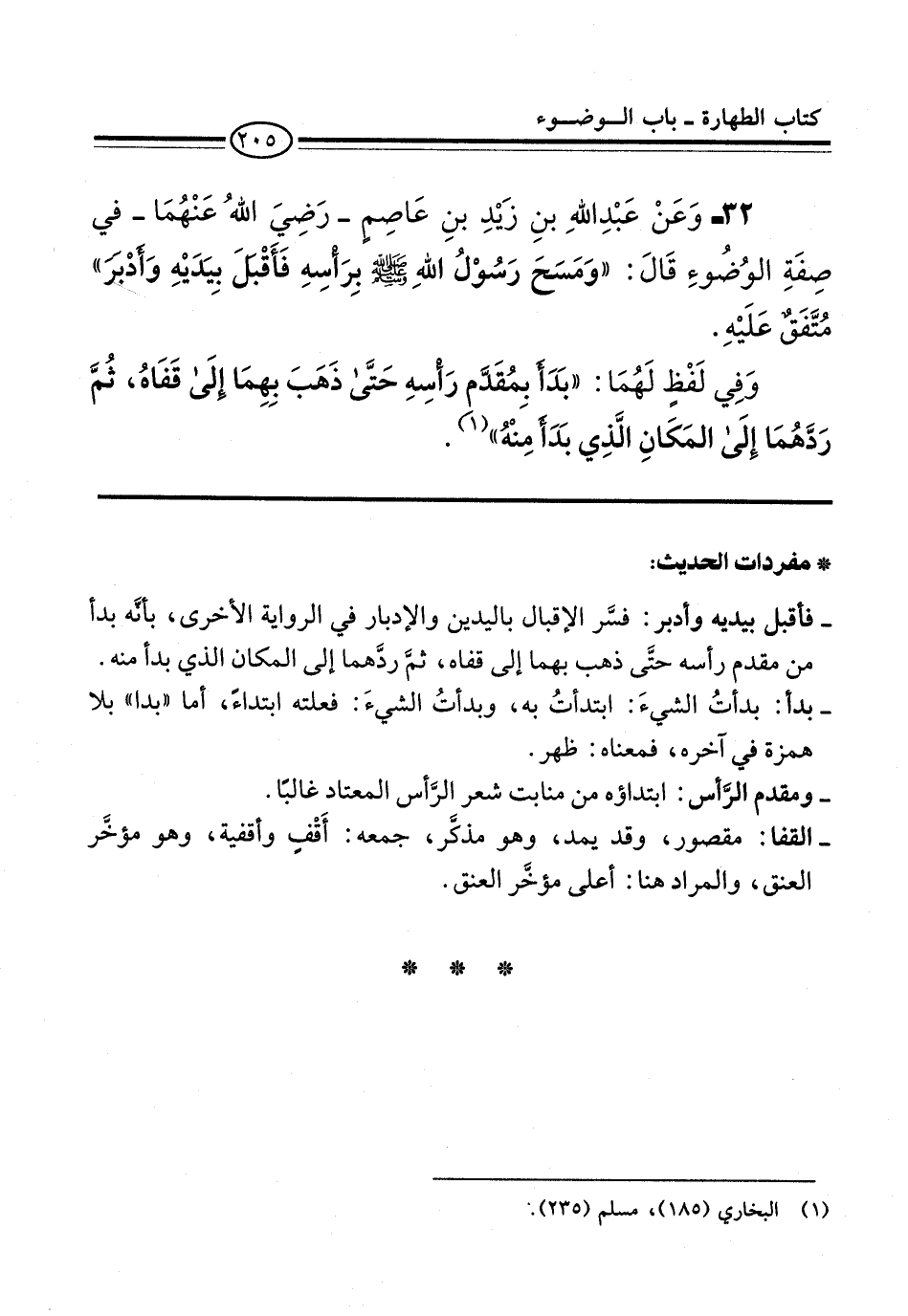 32 - وَعَنْ عَبْدِ اللَّهِ بْنِ زَيْدِ بْنِ عَاصِمٍ -رضي الله عنهما- في صِفَةِ الْوُضُوءِ قَالَ: "وَمَسَحَ رَسُولُ اللهِ -صلى الله عليه وسلم- بِرَأْسِهِ, فَأَقْبَلَ بِيَدَيْهِ وَأَدْبَرَ" مُتَّفَقٌ عَلَيْه.