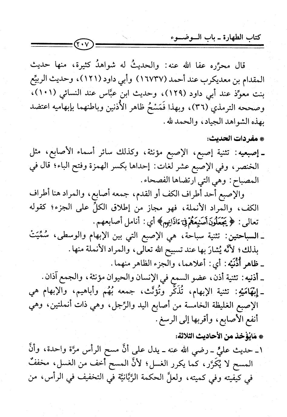 قال محرِّره عفا الله عنه: والحديثُ له شواهدُ كثيرة، منها حديث المقدام بن معديكرب عند أحمد (16737) وأبي داود (121)، وحديث الربيِّع بنت معوِّذ عند أبي داود (129)، وحديث ابن عبَّاس عند النسائي (101)، وصححه الترمذي (36)، وبهذا فَمَسْحُ ظاهر الأُذنين وباطنهما بإبهاميه اعتضد بهذه الشواهد الجياد، والحمد لله.