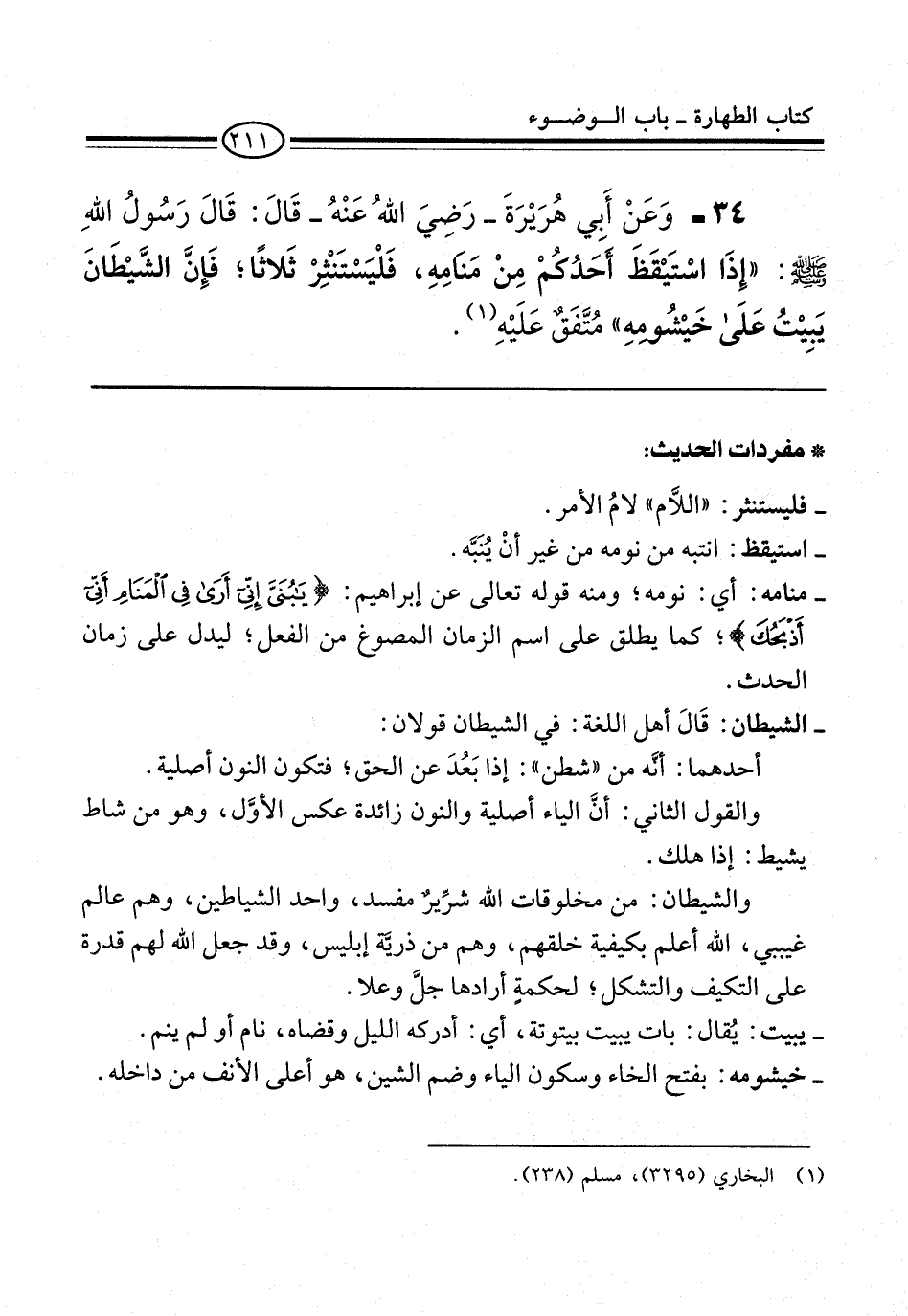 34 - وَعَنْ أَبِي هُرَيْرَةَ -رضي الله عنه- قَالَ: قَالَ رَسُولُ اللَّهِ -صلى الله عليه وسلم-: "إِذَا اسْتَيْقَظَ أَحَدُكُمْ مِنْ مَنَامِهِ فَلْيَسْتَنْثِرْ ثَلَاثًا, فَإِنَّ الشَّيْطَانَ يَبِيتُ عَلَى خَيْشُومِهِ" مُتَّفَقٌ عَلَيْهِ (¬1).