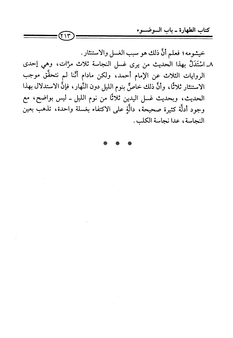 8 - اسْتَدَلَّ بهذا الحديث من يرى غسل النجاسة ثلاث مرَّات، وهي إحدى الروايات الثلاث عن الإمام أحمد، ولكن ما دام أنَّنا لم نتحقَّق موجب الاستنثار ثلاثًا، وأنَّ ذلك خاصٌّ بنوم الليل دون النَّهار، فإنَّ الاستدلال بهذا الحديث، وبحديث غسل اليدين ثلاثًا من نوم الليل -ليس بواضح، مع وجود أدلَّة كثيرة صحيحة، دالَّةٍ على الاكتفاء بغسلة واحدة، تذهب بعين النجاسة، عدا نجاسة الكلب.