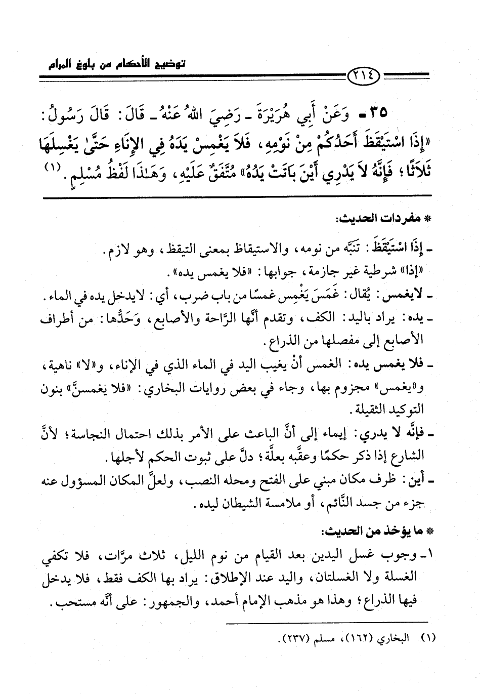 35 - وَعَنْ أَبِي هُرَيْرَةَ -رضي الله عنه- قَالَ: قَالَ رَسُولُ اللَّهِ: -صلى الله عليه وسلم-: "إِذَا اسْتَيْقَظَ أَحَدُكُمْ مِنْ نَوْمِهِ، فَلَا يَغْمِسُ يَدَهُ فِي الْإِنَاءِ حَتَّى يَغْسِلَهَا ثَلَاثًا، فَإِنَّهُ لَا يَدْرِي أَيْنَ بَاتَتْ يَدُهُ" مُتَّفَقٌ عَلَيْهِ، وَهَذَا لَفْظُ مُسْلِمٍ (¬1).