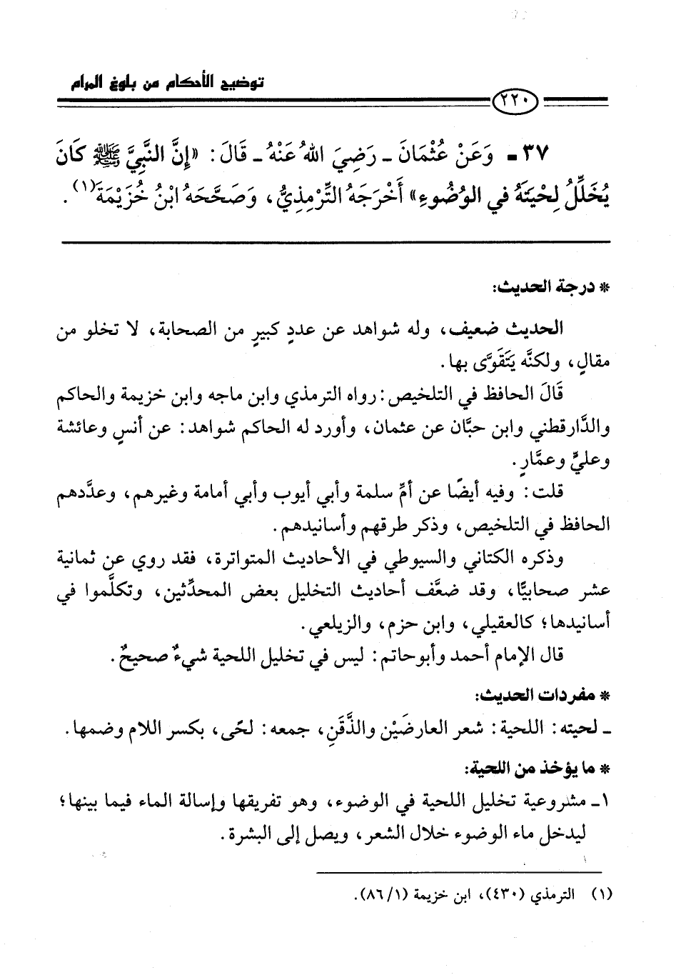 37 - وَعَنْ عُثْمَانَ -رضي الله عنه- قَالَ: "إِنَّ النَّبِيَّ -صلى الله عليه وسلم- كَانَ يُخَلِّلُ لِحْيَتَهُ فِي الْوُضُوءِ" أَخْرَجَهُ التِّرْمِذِيُّ, وَصَحَّحَهُ ابْنُ خُزَيْمَةَ. (¬1)