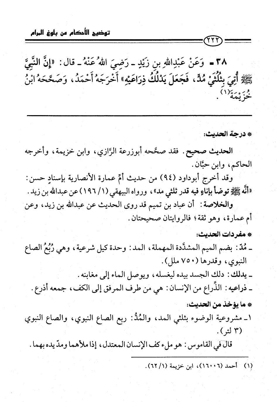 38 - وَعَنْ عَبْدِ اللَّهِ بْنِ زَيْدٍ -رضي الله عنه- قَالَ: "إِنَّ النَّبِيَّ -صلى الله عليه وسلم- أُتَيَ بِثُلُثَيْ مُدٍّ, فَجَعَلَ يَدْلُكُ ذِرَاعَيْهِ" أَخْرَجَهُ أَحْمَدُ, وَصَحَّحَهُ ابْنُ خُزَيْمَةَ. (¬1)