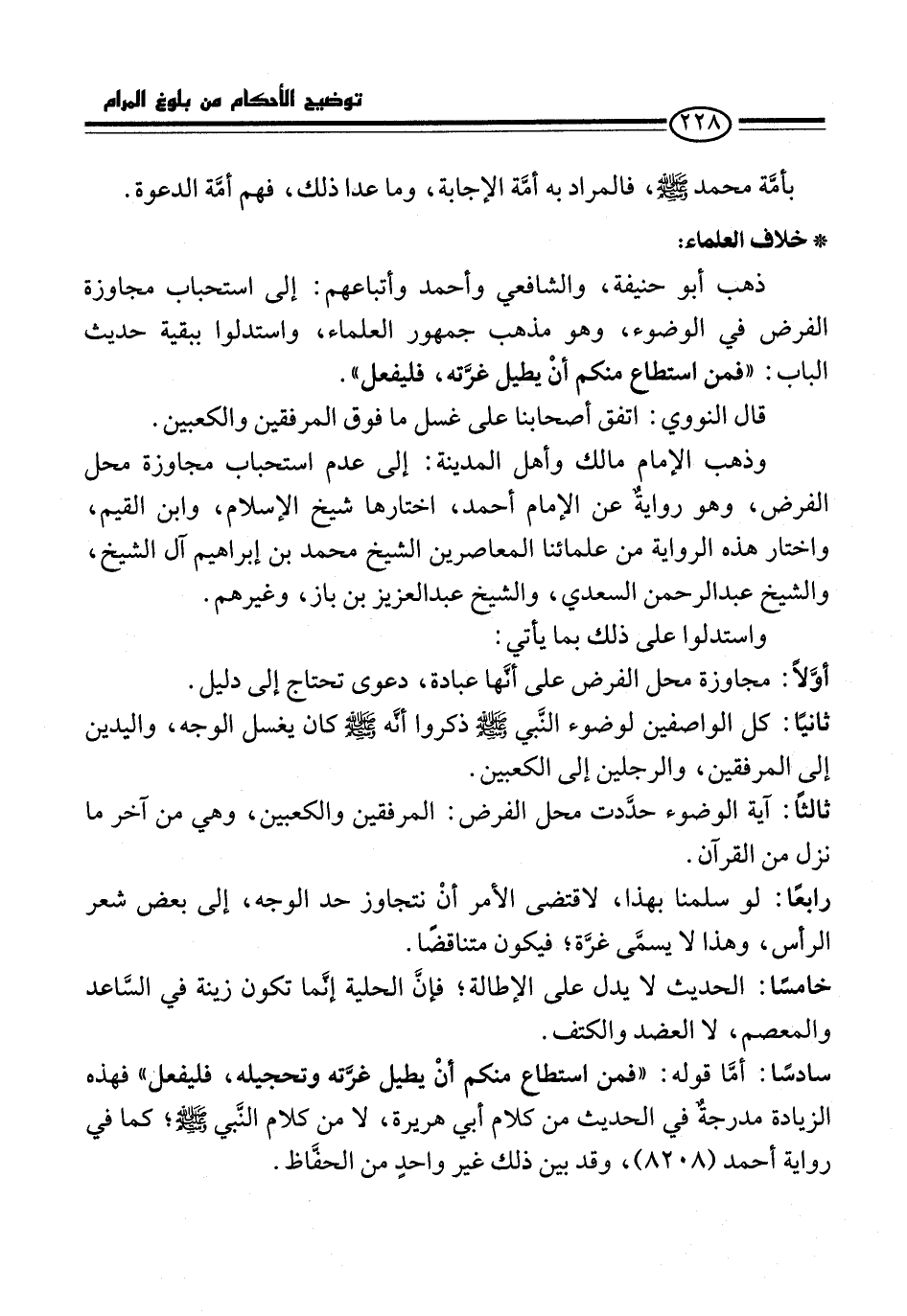 خامسًا: الحديث لا يدل على الإطالة؛ فإنَّ الحلية إنَّما تكون زينة في السَّاعد والمعصم، لا العضد والكتف.