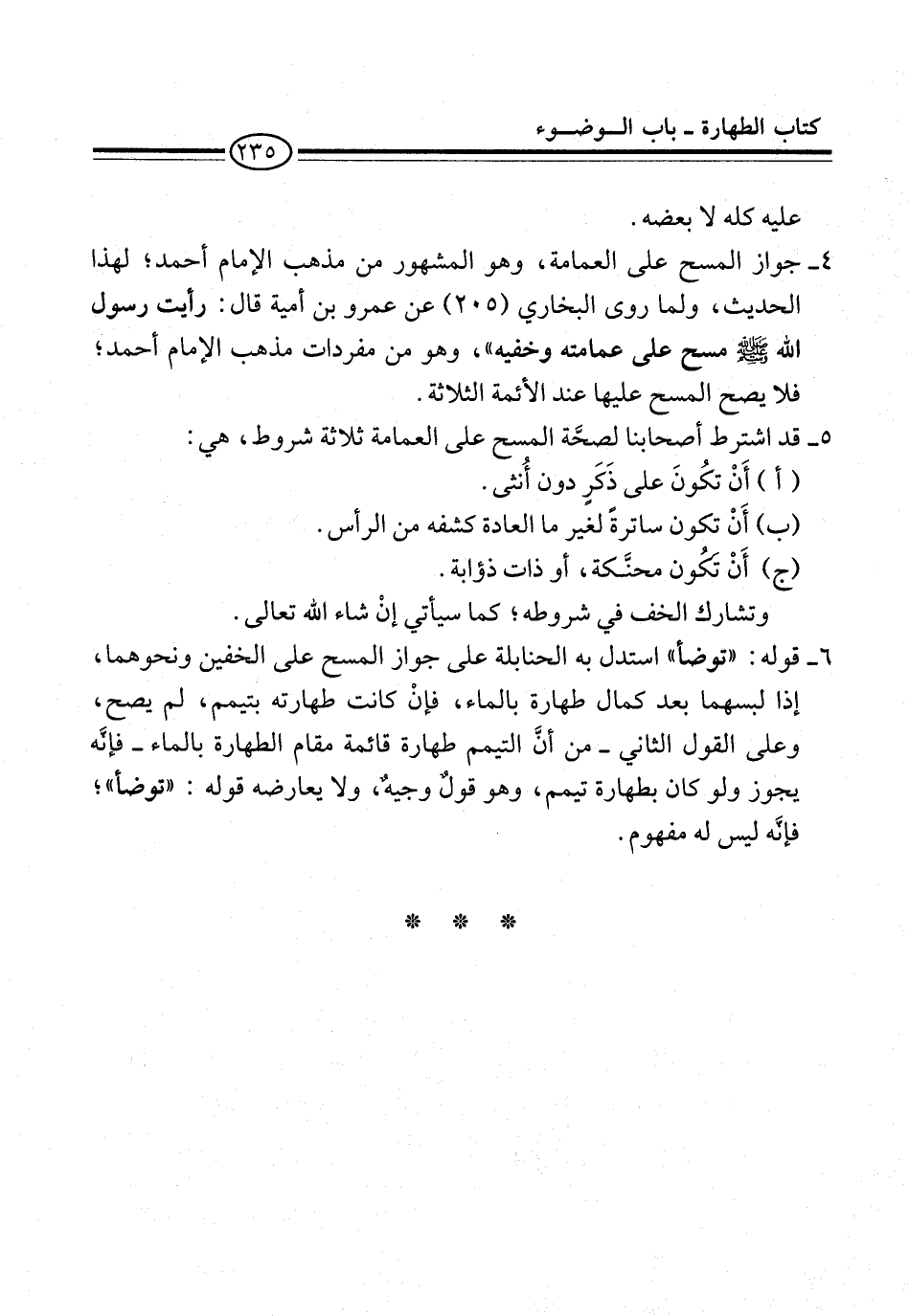 5 - قد اشترط أصحابنا لصحَّة المسح على العمامة ثلاثة شروط، هي:
