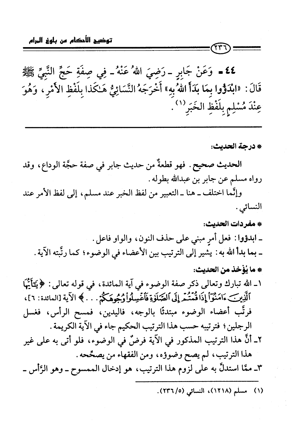 44 - وَعَنْ جَابِرٍ -رَضِيَ اللَّهُ عَنْهُ- فِي صِفَةِ حَجِّ النَّبِيِّ -صَلَّى اللَّهُ عَلَيْهِ وَسَلَّمَ- قَالَ: "ابْدَؤُوا بِمَا بَدَأَ اللَّهُ بِهِ" أَخْرَجَهُ النَّسَائِيُّ هَكَذَا بِلَفْظِ الْأَمْرِ، وَهُوَ عِنْدَ مُسْلِمٍ بِلَفْظِ الْخَبَرِ. (¬1)