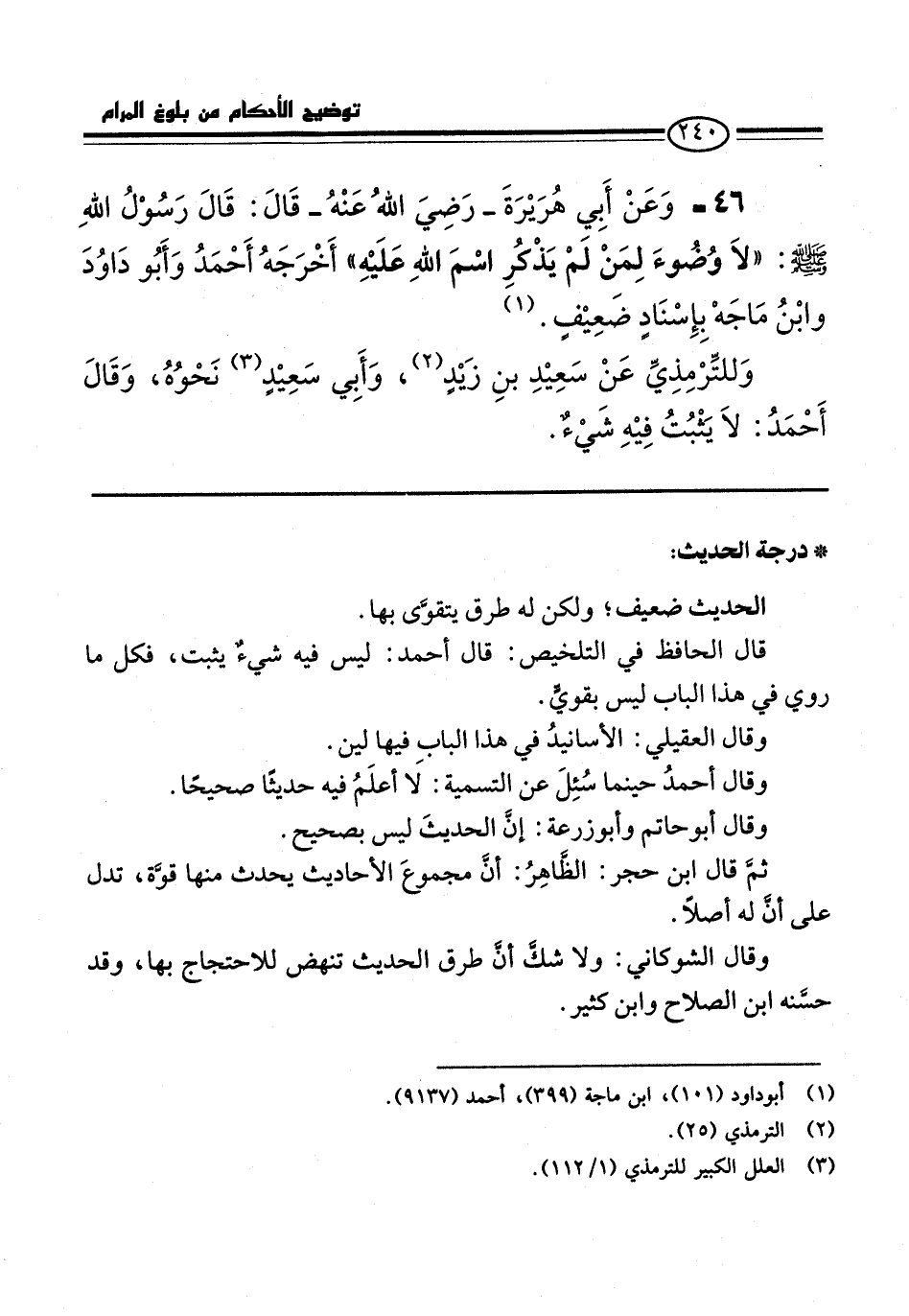 46 - وَعَنْ أَبِي هُرَيْرَةَ -رضي الله عنه- قَالَ: قَالَ رَسُولُ اللَّهِ -صلى الله عليه وسلم-: "لَا وُضُوءَ لِمَنْ لَمْ يَذْكُرِ اسْمَ اللَّهِ عَلَيْهِ" أَخْرَجَهُ أَحْمَدُ وَأَبُو دَاوُدَ وَابْنُ مَاجَهْ بِإِسْنَادٍ ضَعِيْفٍ. (¬1)