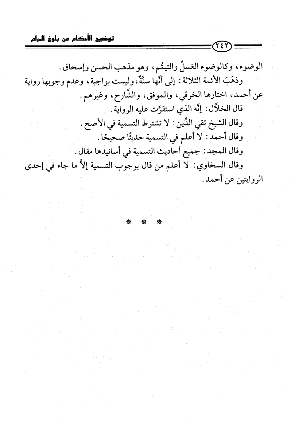 وقال السخاوي: لا أعلم من قال بوجوب التسمية إلاَّ ما جاء في إحدى الروايتين عن أحمد.