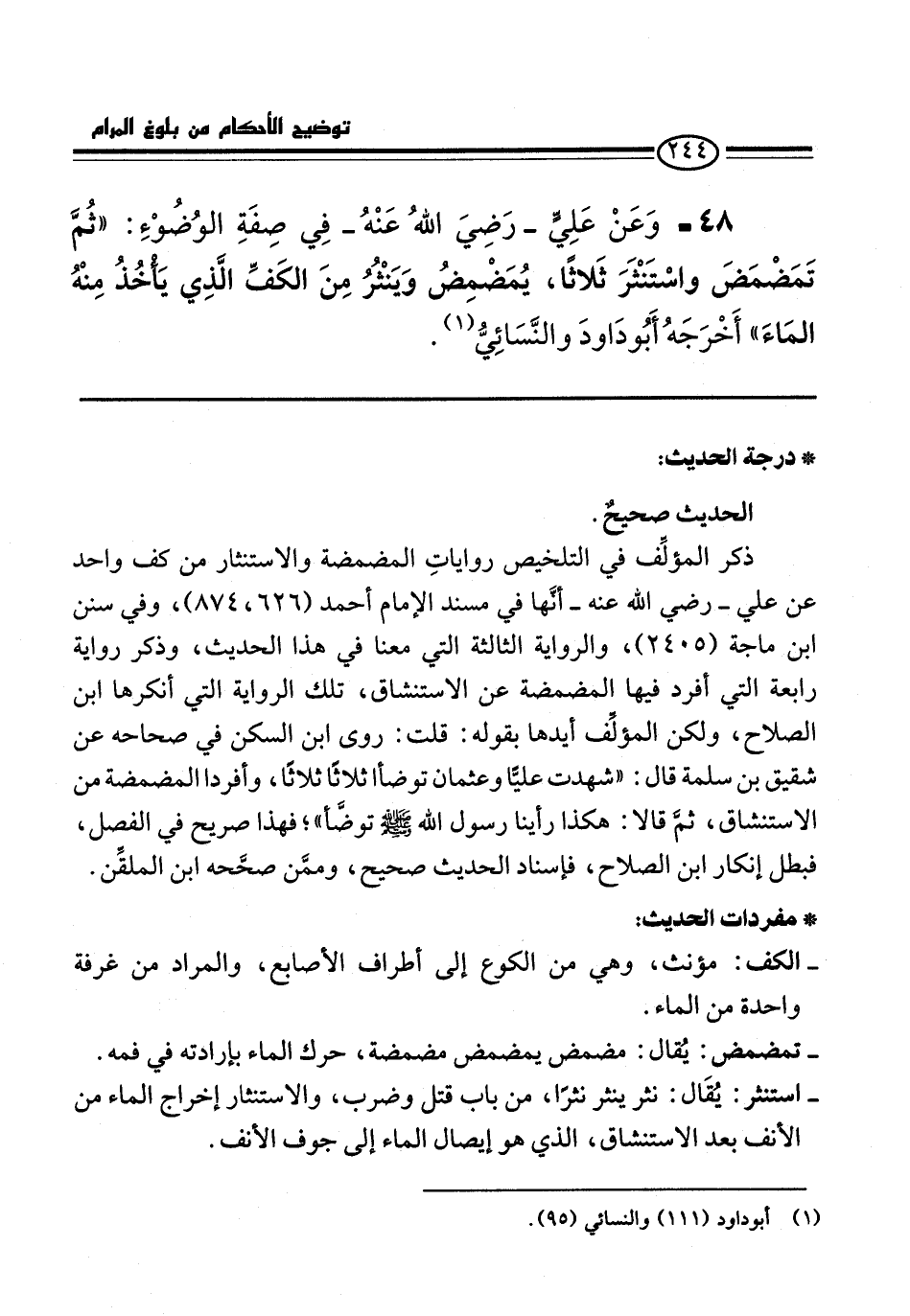 48 - وَعَنْ عَلِيٍّ -رضي الله عنه- فِي صِفَةِ الْوُضُوءِ: "ثُمَّ تَمَضْمَضَ وَاسْتَنْثَرَ ثَلَاثًا, يُمَضْمِضُ وَيَنْثُرُ مِنَ الْكَفِّ الَّذِي يَأْخُذُ مِنْهُ الْمَاءَ" أَخْرَجَهُ أَبُو دَاوُدَ وَالنَّسَائِيُّ (¬1).