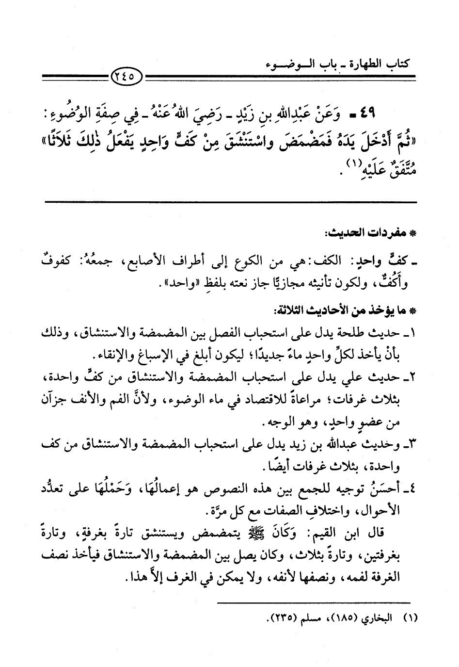 49 - وَعَنْ عَبْدِ اللَّهِ بْنِ زَيْدٍ -رضي الله عنه- فِي صِفَةِ الْوُضُوءِ: "ثُمَّ أَدْخَلَ يَدَهُ فَمَضْمَضَ وَاسْتَنْشَقَ مِنْ كَفٍّ وَاحِدَةٍ يَفْعَلُ ذَلِكَ ثَلَاثًا" مُتَّفَقٌ عَلَيْهِ (¬1).