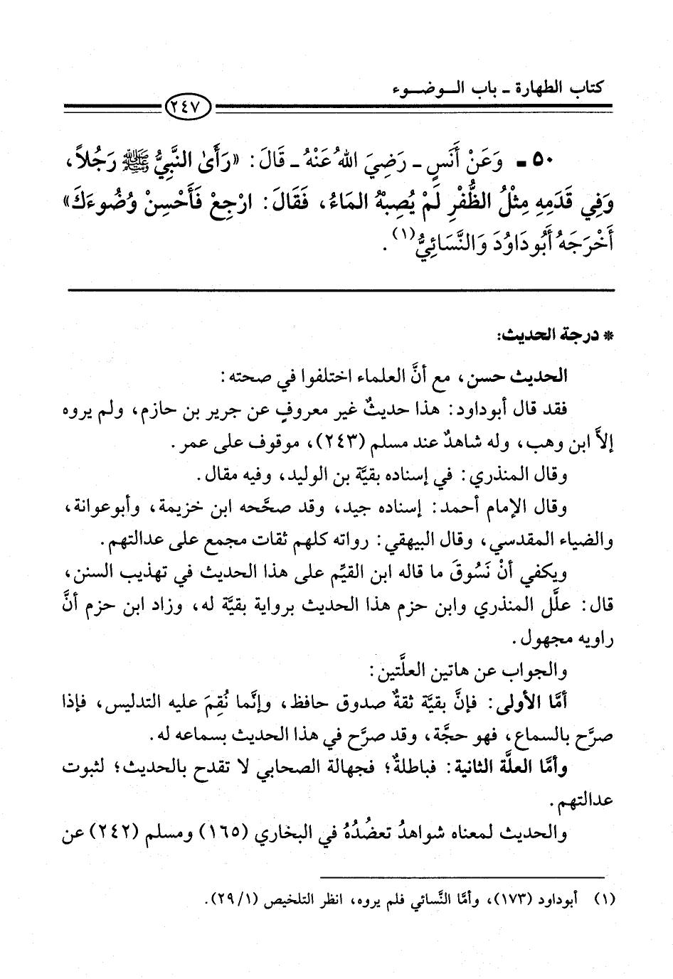 50 - وَعَنْ أَنَسٍ -رضي الله عنه- قَالَ: "رَأَى النَّبِيُّ -صلى الله عليه وسلم- رَجُلًا, وَفِي قَدَمِهِ مِثْلُ الظُّفْرِ لَمْ يُصِبْهُ الْمَاءُ. فَقَالَ: ارْجِعْ فَأَحْسِنْ وُضُوءَكَ" أَخْرَجَهُ أَبُو دَاوُدَ وَالنَّسَائِيُّ (¬1).