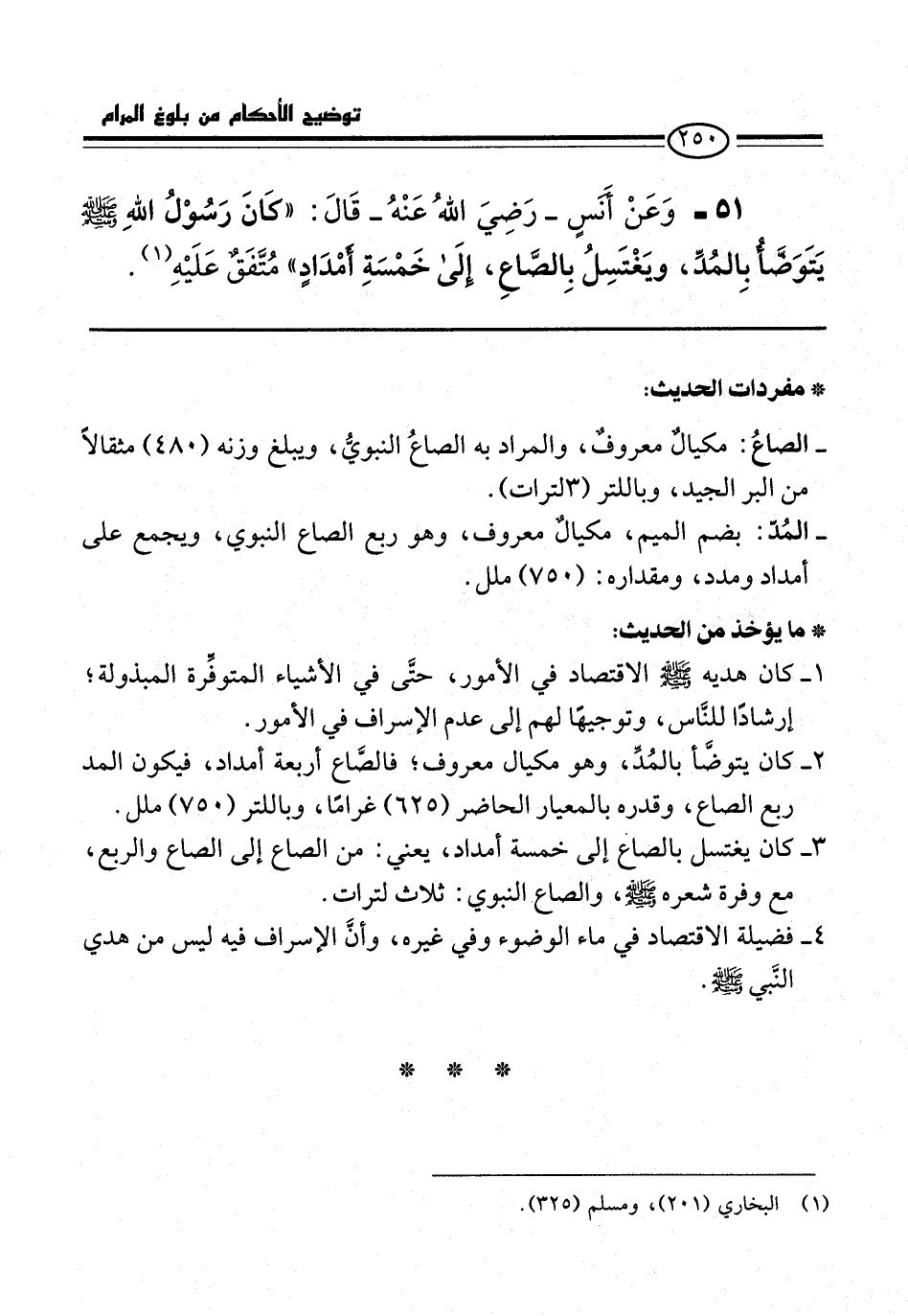 51 - وَعَنْ أَنَسٍ -رضي الله عنه- قَالَ: "كَانَ رَسُولُ اللَّهِ -صلى الله عليه وسلم- يَتَوَضَّأُ بِالْمُدِّ, وَيَغْتَسِلُ بِالصَّاعِ، إِلَى خَمْسَةِ أَمْدَادٍ" مُتَّفَقٌ عَلَيْهِ (¬1).