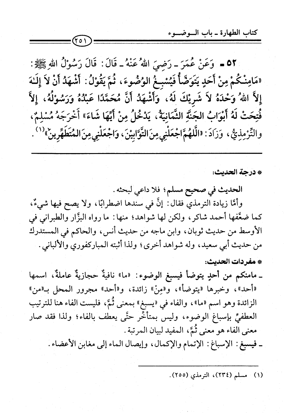 52 - وَعَنْ عُمَرَ -رضي الله عنه- قَالَ: قَالَ رَسُولُ اللَّهِ -صلى الله عليه وسلم-: "مَا مِنْكُمْ مِنْ أَحَدٍ يَتَوَضَّأُ فَيُسْبِغُ الْوُضُوءَ, ثُمَّ يَقُولُ: أَشْهَدُ أَنْ لَا إِلَهَ إِلَّا اللَّهُ وَحْدَهُ لَا شَرِيكَ لَهُ, وَأَشْهَدُ أَنَّ مُحَمَّدًا عَبْدُهُ وَرَسُولُهُ, إِلَّا فُتِحَتْ لَهُ أَبْوَابُ الجَنَّةِ الثَّمَانِيَةُ، يَدْخُلُ مِنَ أَيِّهَا شَاءَ". أَخْرَجَهُ مُسْلِمٌ، وَالتِّرْمِذِيُّ, وَزَادَ: "اللَّهُمَّ اجْعَلْنِي مِنَ التَّوَّابِينَ, وَاجْعَلْنِي مِنَ الْمُتَطَهِّرِينَ" (¬1).