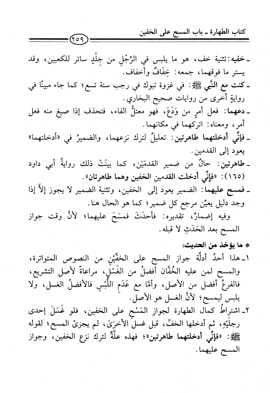 - فمسح عليهما: الضمير يعود إلى الخفين، وتثنية الضمير لا يجوز إلاَّ إذا وجد دليل يعيِّن مرجع كل ضميرة كما هو الحال هنا.