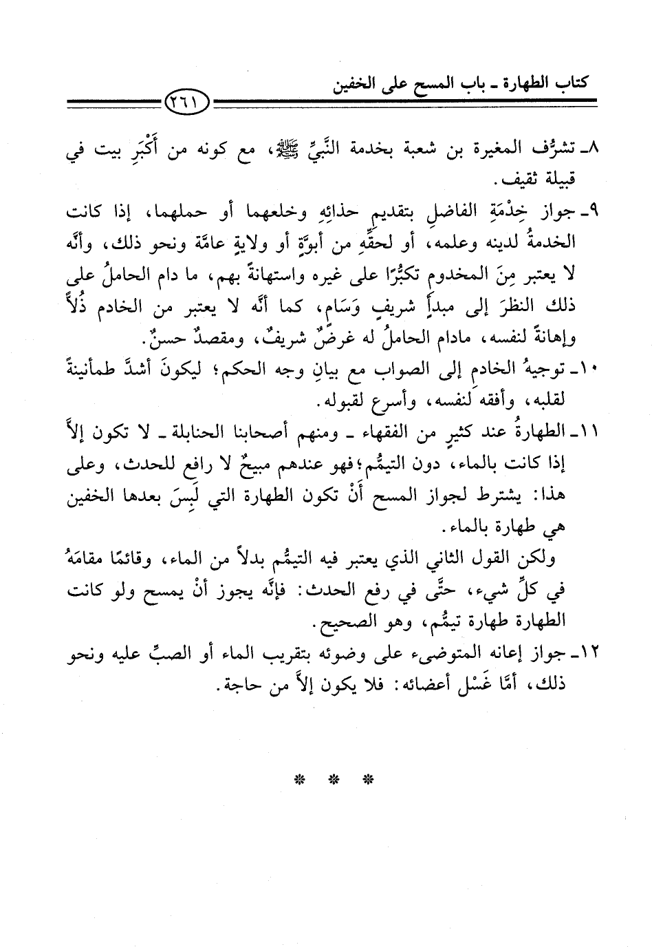11 - الطهارةُ عند كثيرٍ من الفقهاء -ومنهم أصحابنا الحنابلة- لا تكون إلاَّ إذا كانت بالماء، دون التيمُّم؛ فهو عندهم مبيحٌ لا رافع للحدث، وعلى هذا: يشترط لجواز المسح أَنْ تكون الطهارة التي لَبِسَ بعدها الخفين هي طهارة بالماء.