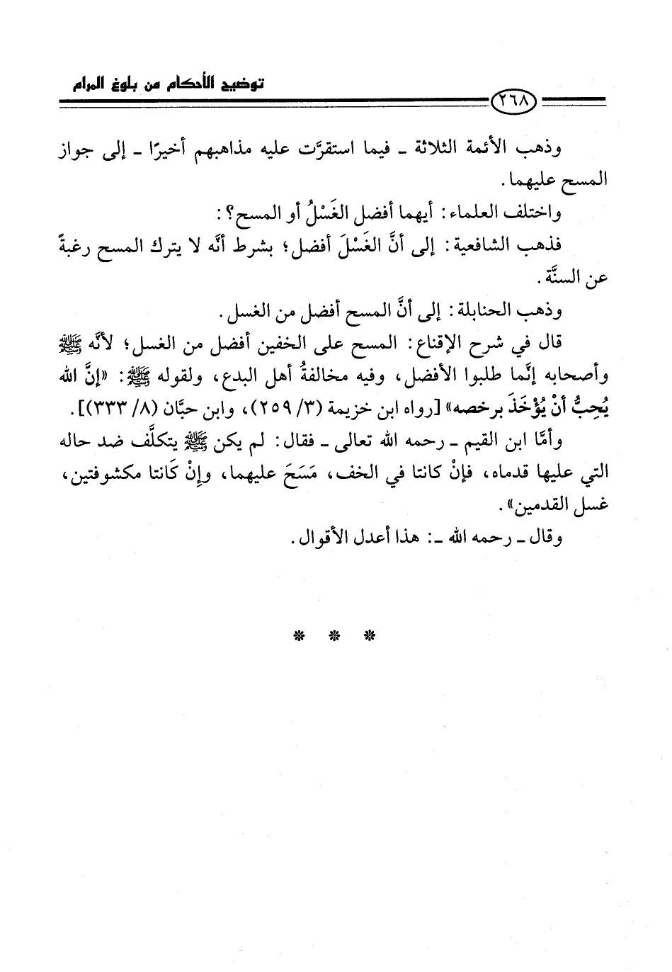 وأمَّا ابن القيم -رحمه الله تعالى- فقال: لم يكن -صلى الله عليه وسلم- يتكلَّف ضد حاله التي عليها قدماه، فإنْ كانتا في الخف، مَسَحَ عليهما، وإِنْ كَانتا مكشوفتين، غسل القدمين".