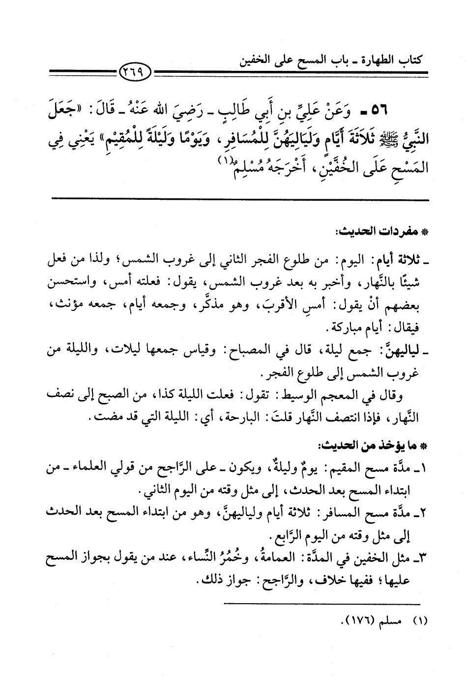 56 - وَعَنْ عَلِيِّ بْنِ أَبِي طَالِبٍ -رضي الله عنه- قَالَ: "جَعَلَ النَّبِيُّ -صلى الله عليه وسلم- ثَلَاثَةَ أَيَّامٍ وَلَيَالِيَهُنَّ لِلْمُسَافِرِ, وَيَوْمًا وَلَيْلَةً لِلْمُقِيمِ" يَعْنِي فِي الْمَسْحِ عَلَى الْخُفَّيْنِ، أَخْرَجَهُ مُسْلِمٌ (¬1).