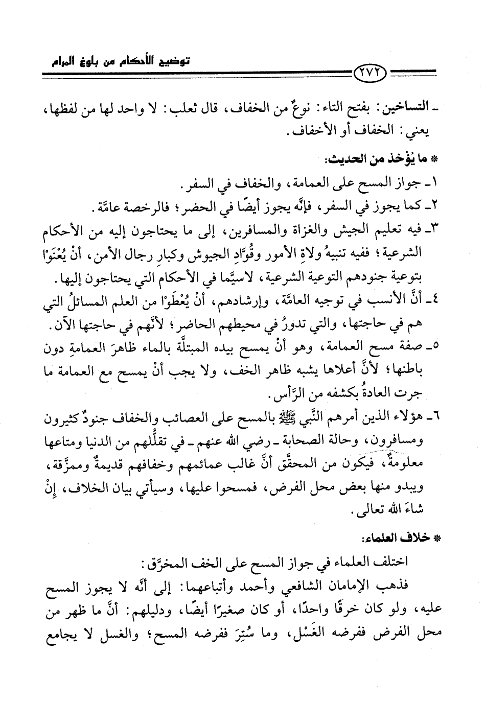 5 - صفة مسح العمامة، وهو أنْ يمسح بيده المبتلَّة بالماء ظاهرَ العمامةِ دون باطنها؛ لأنَّ أعلاها يشبه ظاهر الخف، ولا يجب أنْ يمسح مع العمامة ما جرت العادةُ بكشفه من الرَّأس.