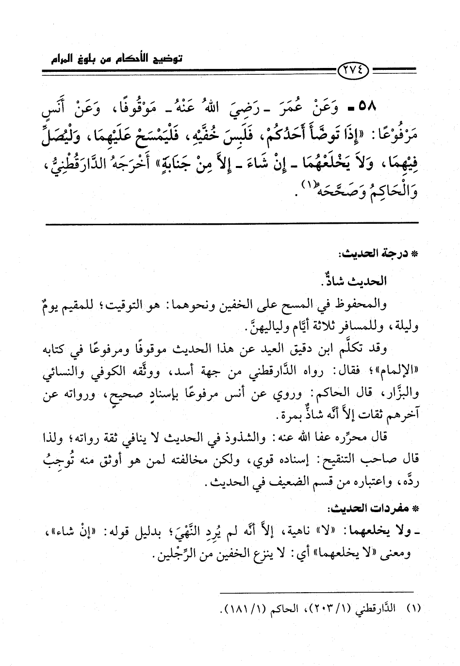 58 - وَعَنْ عُمَرَ -رضي الله عنه- مَوْقُوفًا، وَعَنْ أَنَسٍ مَرْفُوعًا: "إِذَا تَوَضَّأَ أَحَدُكُمْ، فَلَبِسَ خُفَّيْهِ، فَلْيَمْسَحْ عَلَيْهِمَا, وَلْيُصَلِّ فِيهِمَا, وَلَا يَخْلَعْهُمَا -إِنْ شَاءَ- إِلَّا مِنْ جَنَابَةٍ". أَخْرَجَهُ الدَّارَقُطْنِيُّ, وَالْحَاكِمُ وَصَحَّحَهُ (¬1).