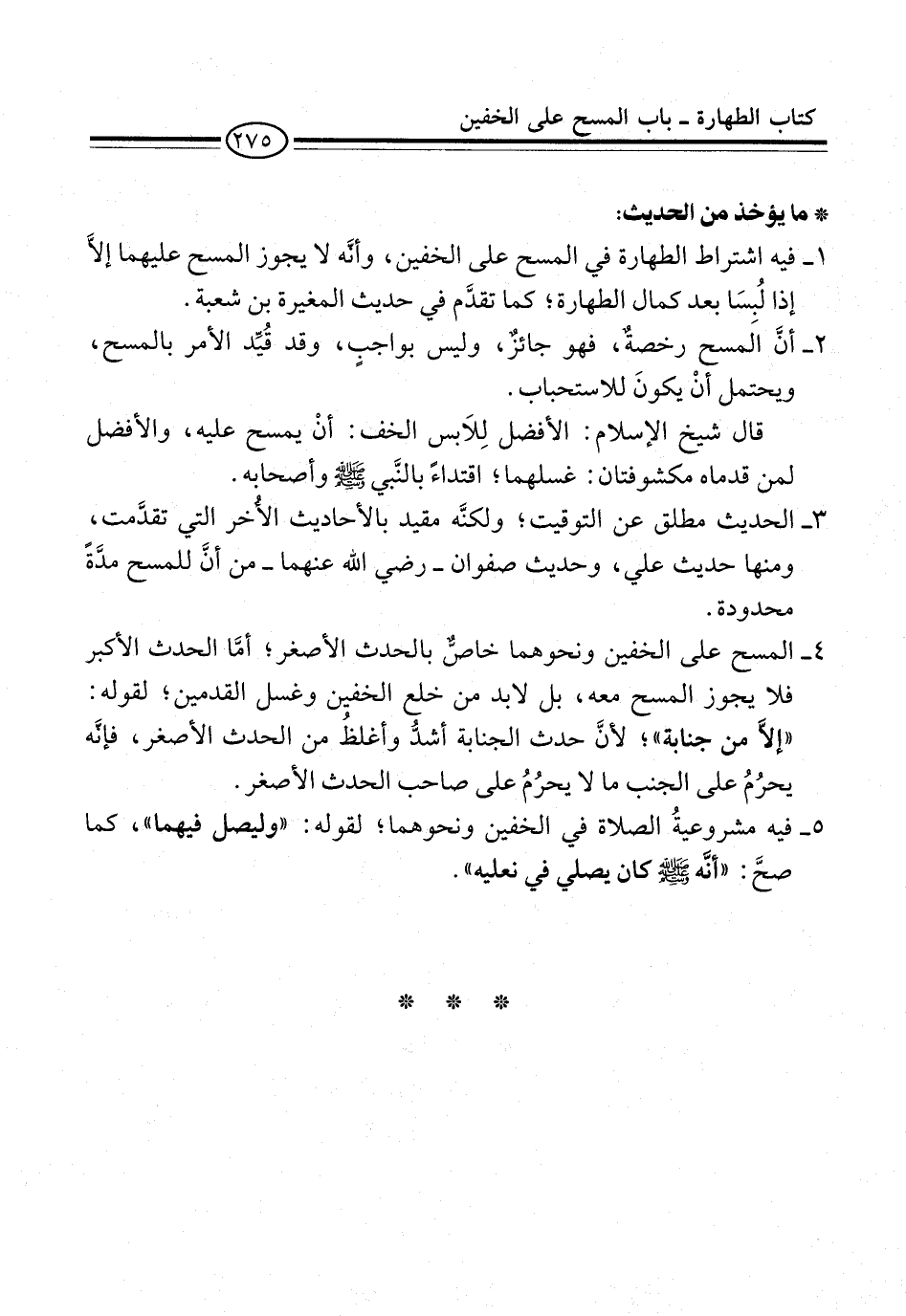 3 - الحديث مطلق عن التوقيت؛ ولكنَّه مقيد بالأحاديث الأُخر التي تقدَّمت، ومنها حديث علي، وحديث صفوان -رضي الله عنهما- من أنَّ للمسح مدَّةً محدودة.