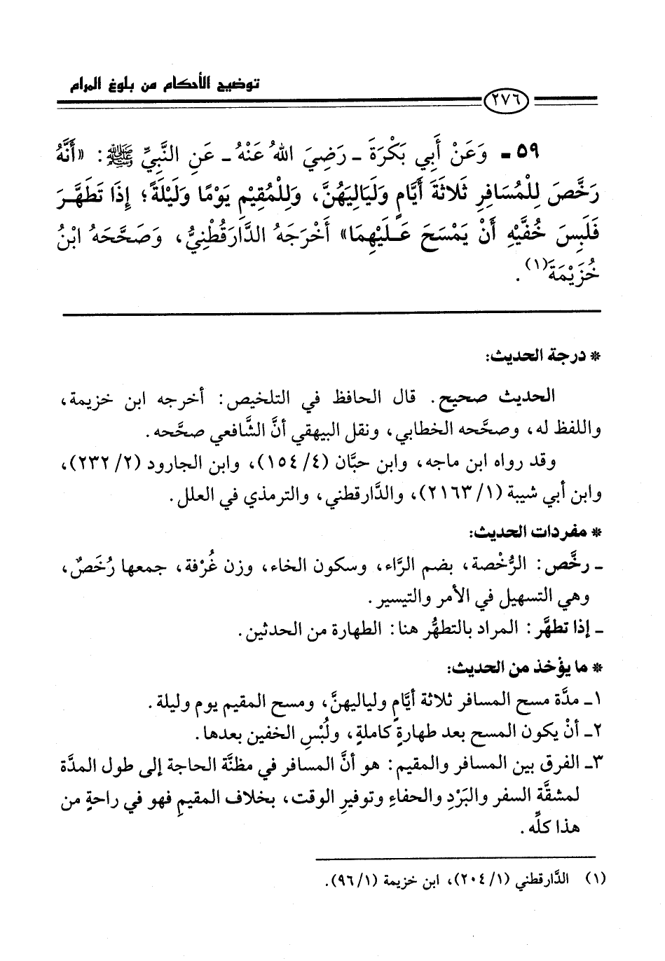 59 - وَعَنْ أَبِي بَكْرَةَ -رضي الله عنه- عَنِ النَّبِيِّ -صلى الله عليه وسلم-: "أَنَّهُ رَخَّصَ لِلْمُسَافِرِ ثَلَاثَةَ أَيَّامٍ وَلَيَالِيَهُنَّ, وَلِلْمُقِيمِ يَوْمًا وَلَيْلَةً؛ إِذَا تَطَهَّرَ فَلَبِسَ خُفَّيْهِ أَنْ يَمْسَحَ عَلَيْهِمَا" أَخْرَجَهُ الدَّارَقُطْنِيُّ, وَصَحَّحَهُ ابْنُ خُزَيْمَةَ (¬1).
